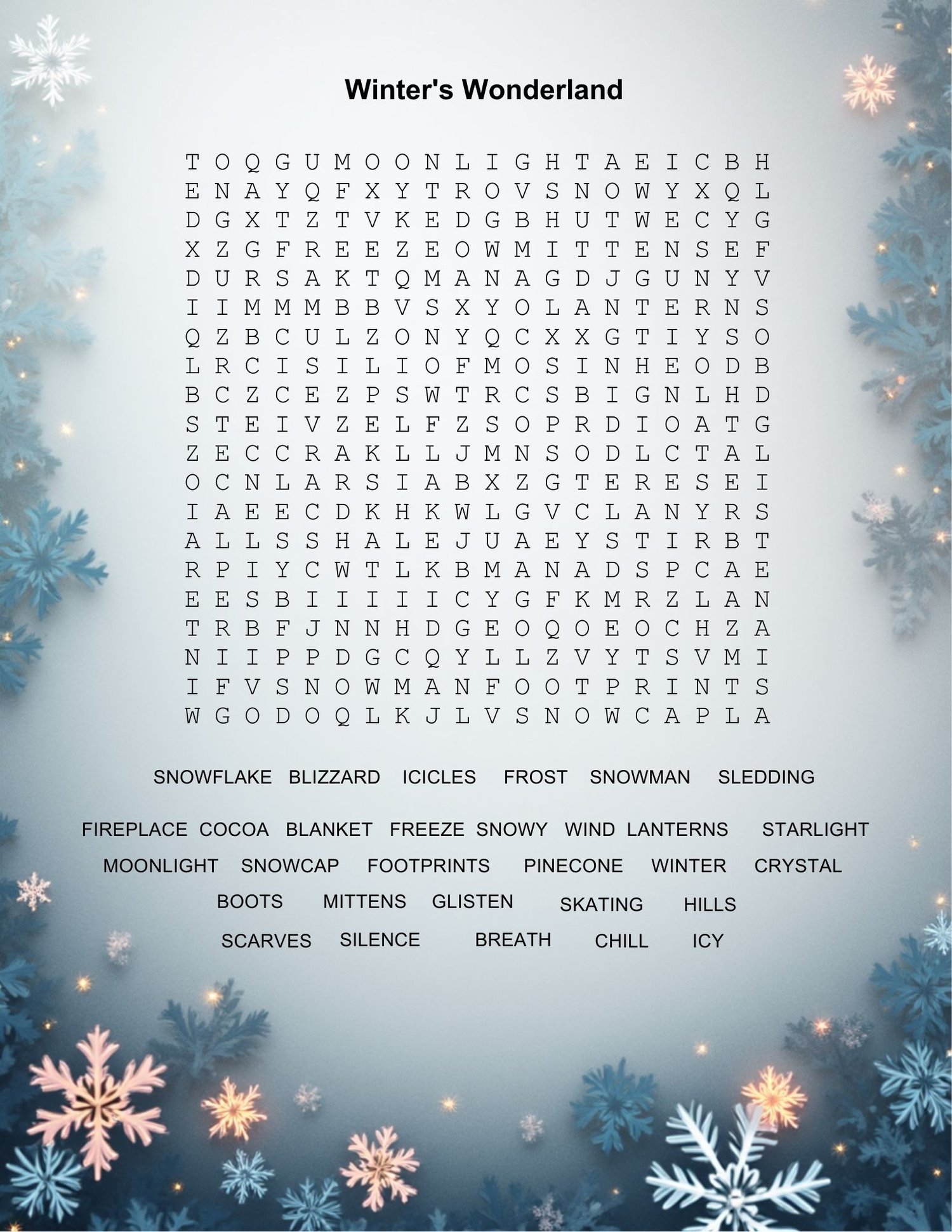 This printable includes a 20×20 grid, 30 winter-themed words, and a beautiful frosty background with snowflakes and icy blue tones.