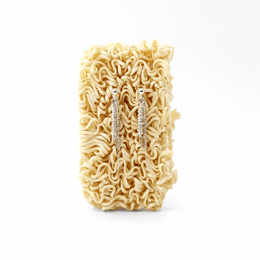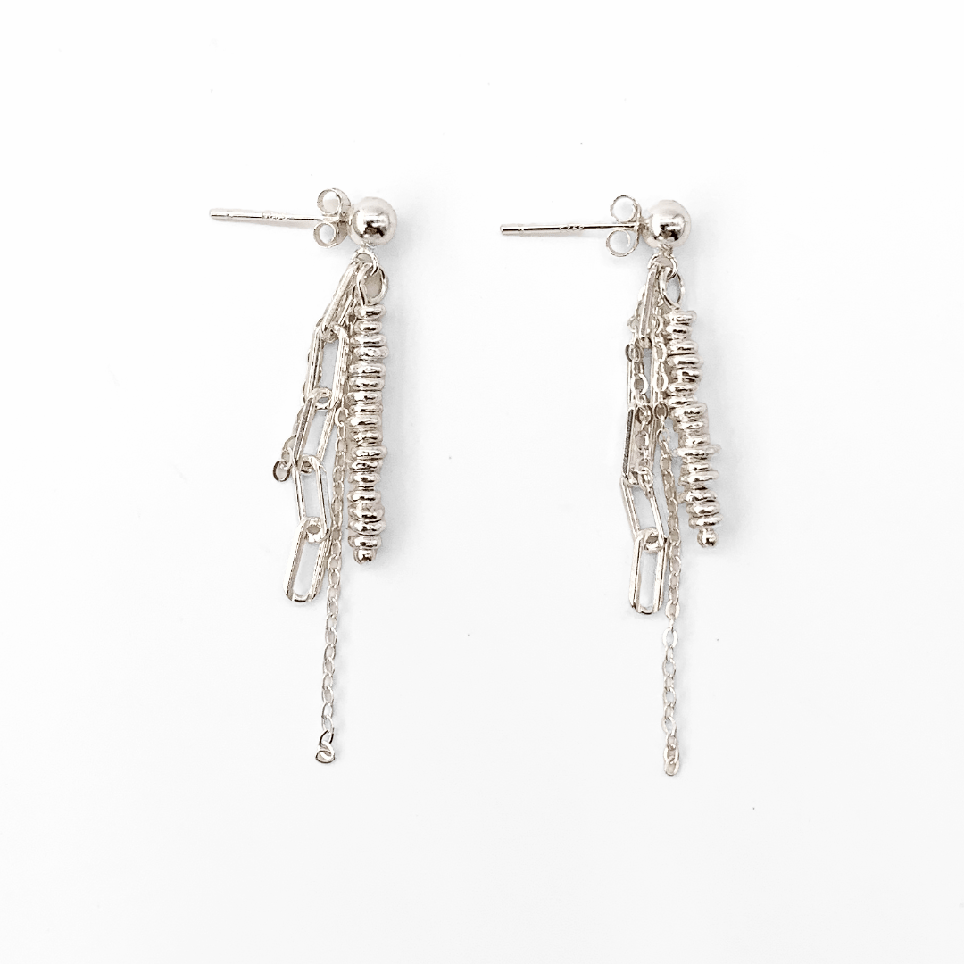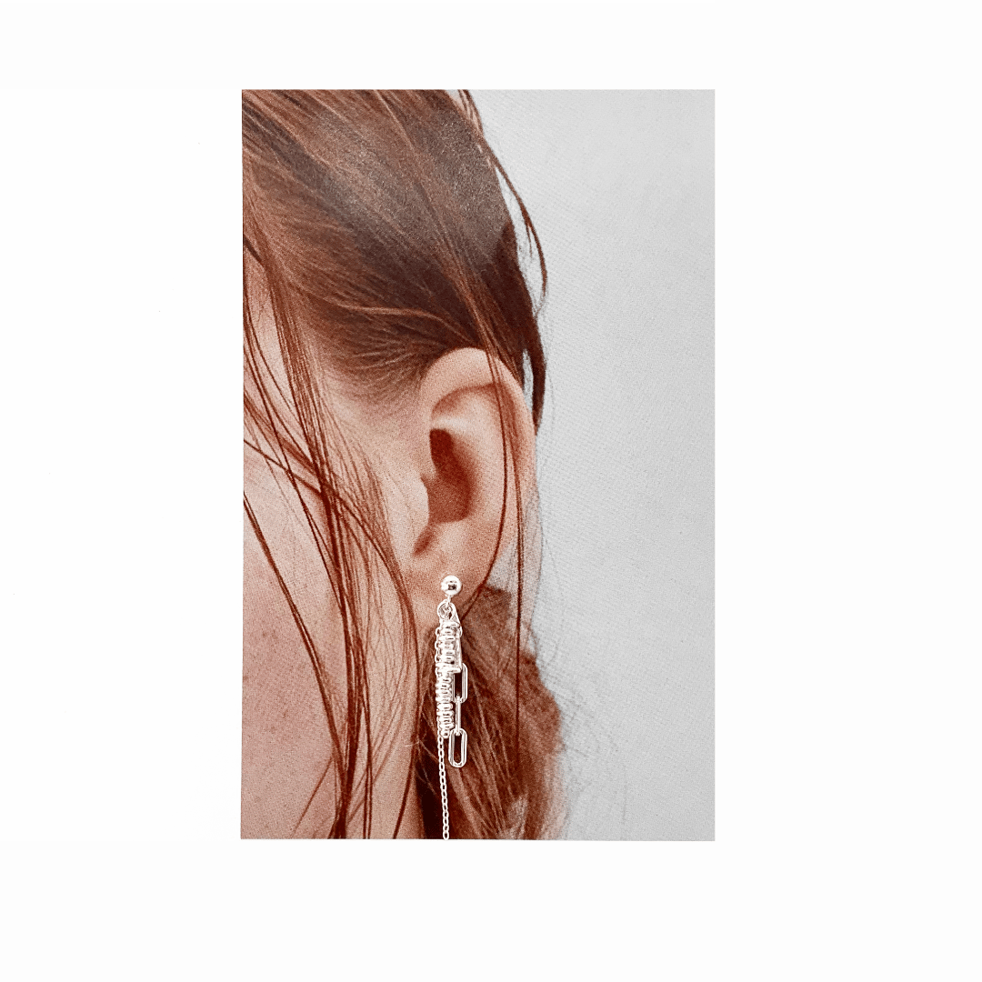Interlaced silver chains and beads create a subtle trembling silhouette — lightweight with a structured chill.