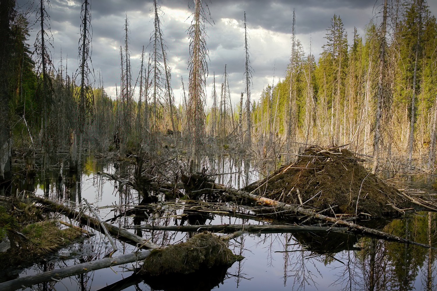 The beavers have made a creek dam and the area is flooded. A lot of trees are dead. In the foreground a beaver's nest.