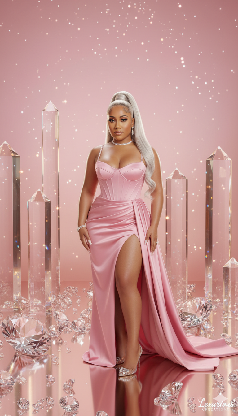 Step into pure opulence with the Remixed Diamond Royal Edition from Lexurious CKreations. This ultra-detailed AI art prompt features a stunning African American woman in a rose-pink satin gown with diamond accents, standing in a luxury studio filled with crystal reflections and soft pink light. Perfect for AI artists, digital designers, and fashion creatives looking to produce high-end, photorealistic imagery with regal energy.
