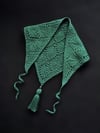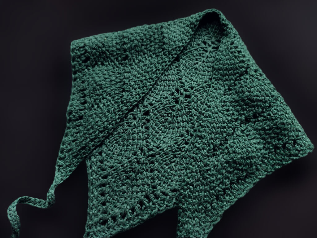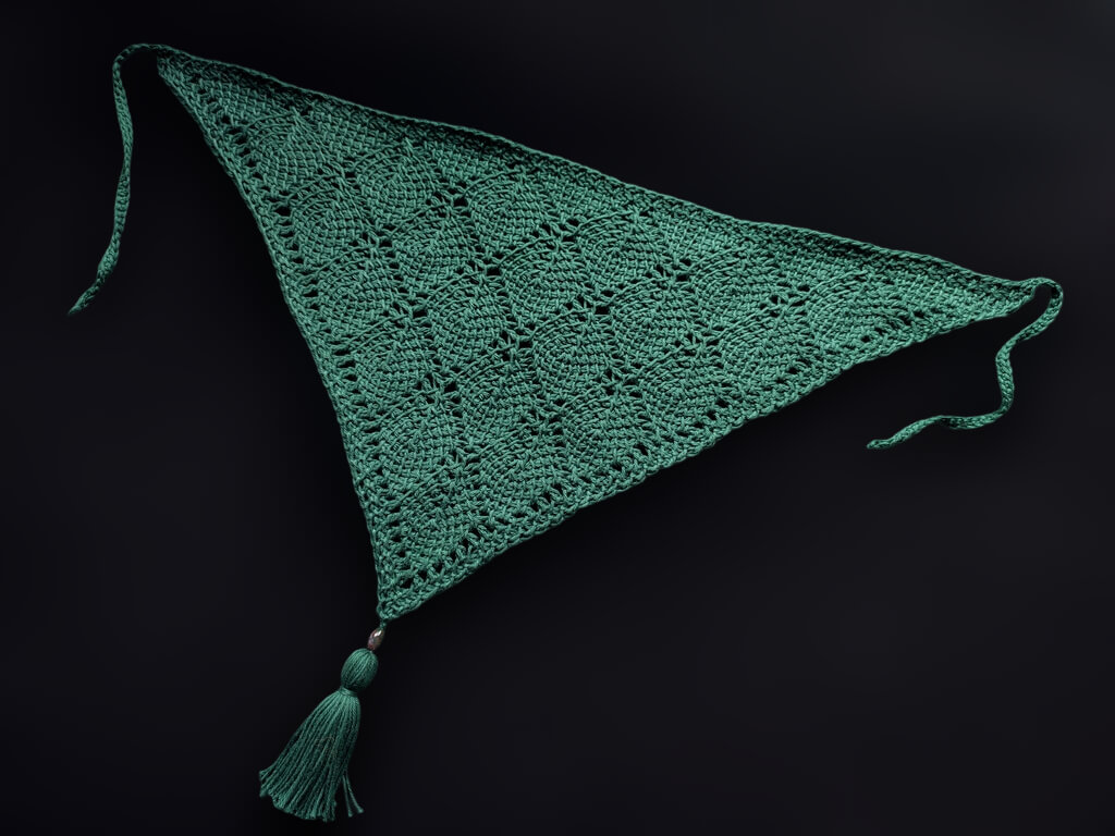 This is an intermediate Tunisian crochet lace pattern triangle-shaped bandana with ties. It is built from the tip at the bottom and it grows with each row.