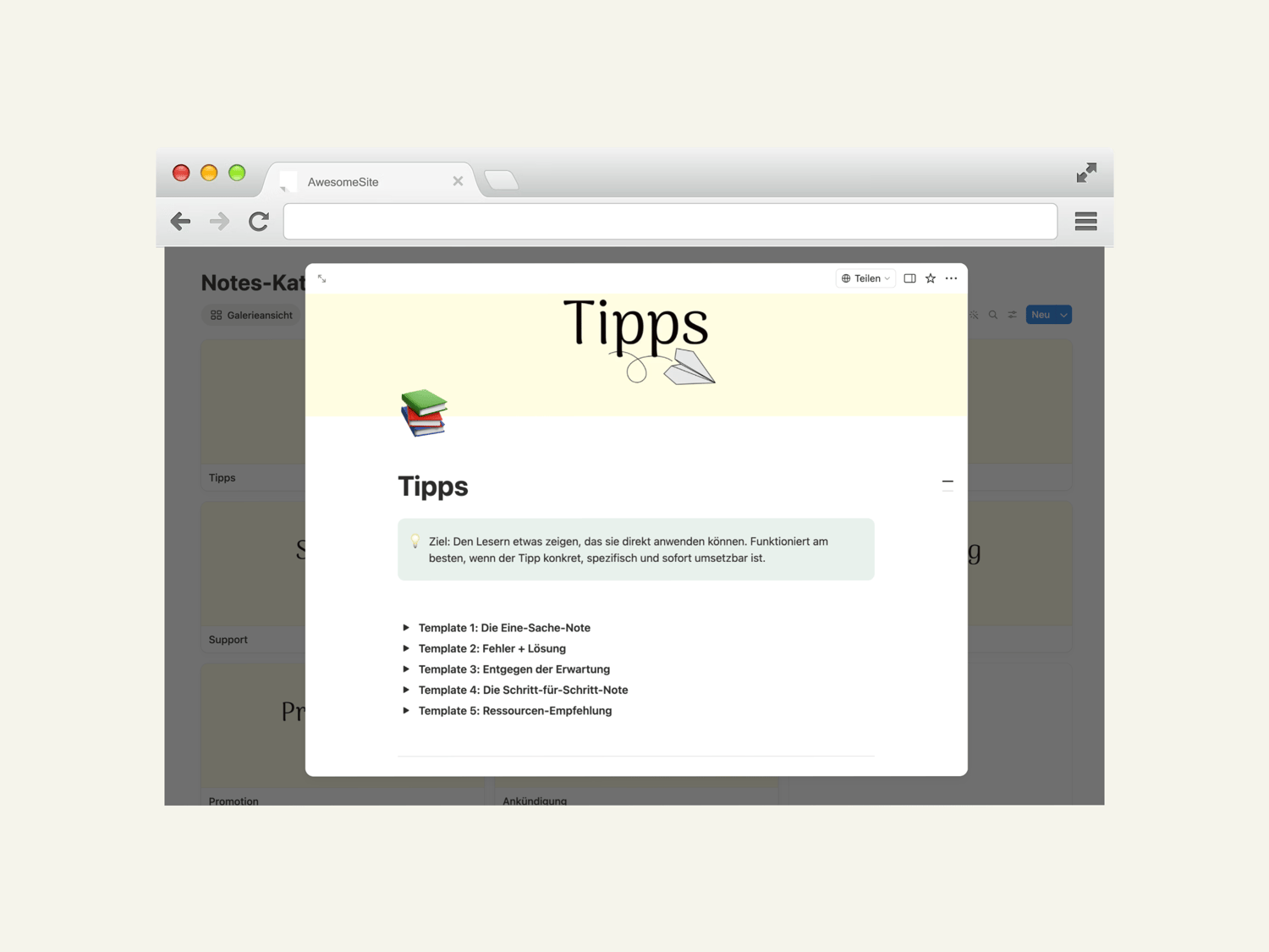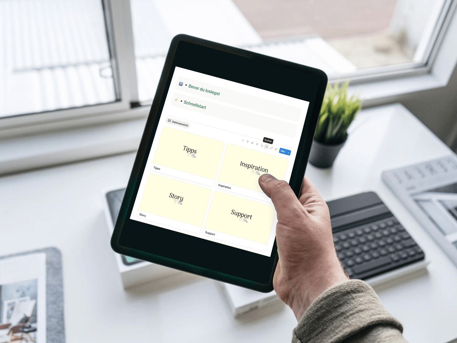 Der Notes-Baukasten gibt dir 8 Kategorien, 40 Templates und 80+ fertige Ideen in einer flexible Notion-Vorlage, die du um eigene Themen und Ideen erweitern kannst. Ein Werkzeug, das mit dir wächst.