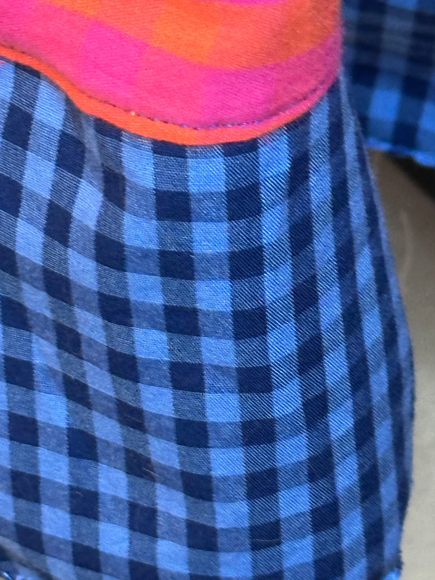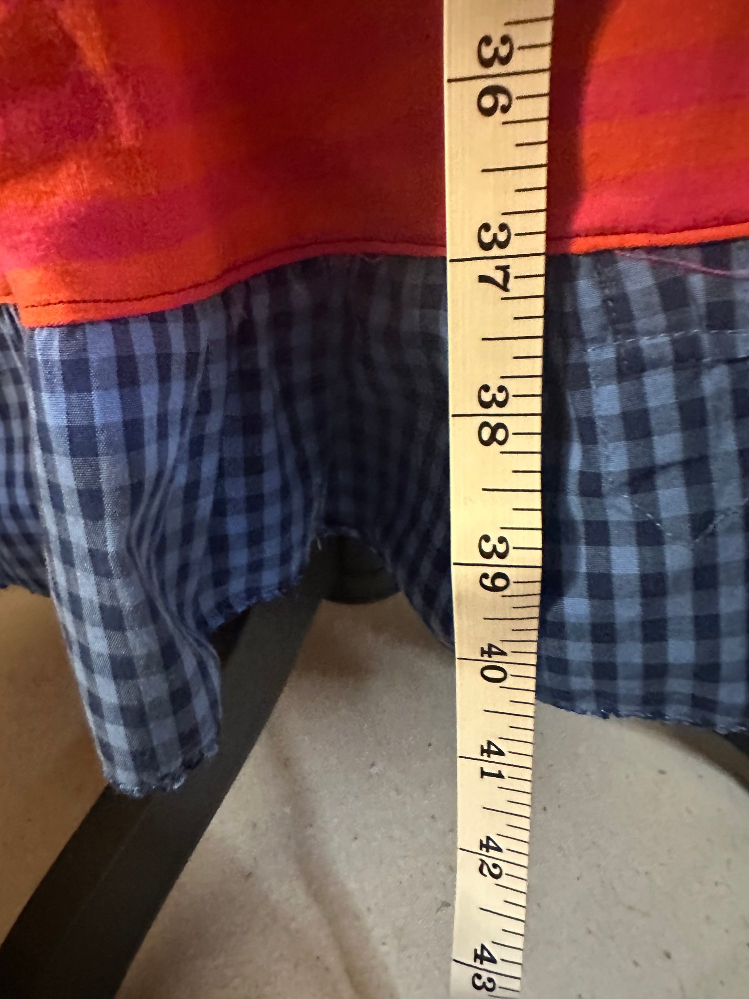 Cheer on in sustainable style with this one-of-a-kind drop waist dress, handmade from a bold graphic tee and layered with vibrant fabrics. The top reads “Let’s Hear It for the Boys” in crisp white lettering on a bright cobalt blue base, while the hemline features playful mixed fabrics in Bright Winter hues: a pop of coral-pink stripes layered over classic blue gingham plaid.