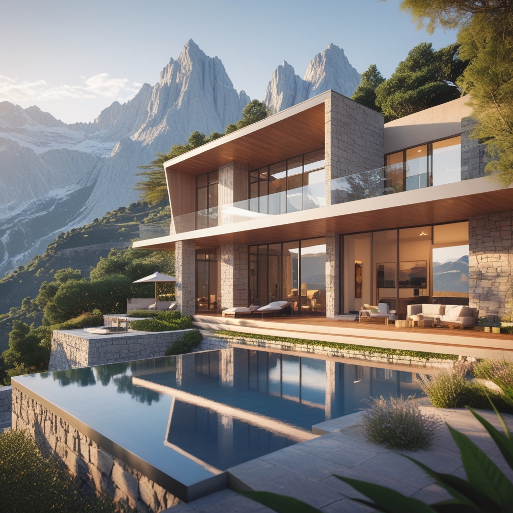 “A stunning luxury house perched on a mountainside, blending modern architecture with natural surroundings. The home features floor-to-ceiling glass windows, sleek wooden and stone accents, and expansive terraces overlooking dramatic mountain peaks and lush valleys. The outdoor area includes an infinity pool reflecting the sky, cozy lounge spaces, and landscaped gardens with native flora. Soft sunlight bathes the scene, casting warm highlights on the façade and creating long, elegant shadows across the terraces. The atmosphere is serene, sophisticated, and inviting, with crisp mountain air, cinematic lighting, and ultra-realistic textures in glass, stone, wood, and foliage. Wide-angle perspective, vibrant yet natural color palette, capturing breathtaking views and the harmony of modern luxury with nature.”