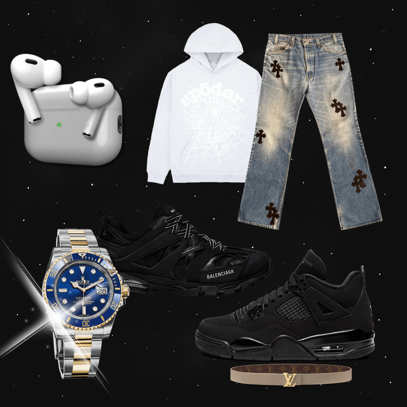 Absolutely everything from cologne, hats, chains, clothes (designer clothing, sp5der, denim tears, polo, etc), electronics (apple products, smart watches, dyson hair dryers, beats, bose, speakers), shoes (jordans, nike, dior, lv, adidas new balance, Balenciaga, etc), and accessories (jewerly, chains, bags, wallets, beanies, hats, glasses, phone cases, chrome hearts etc).
