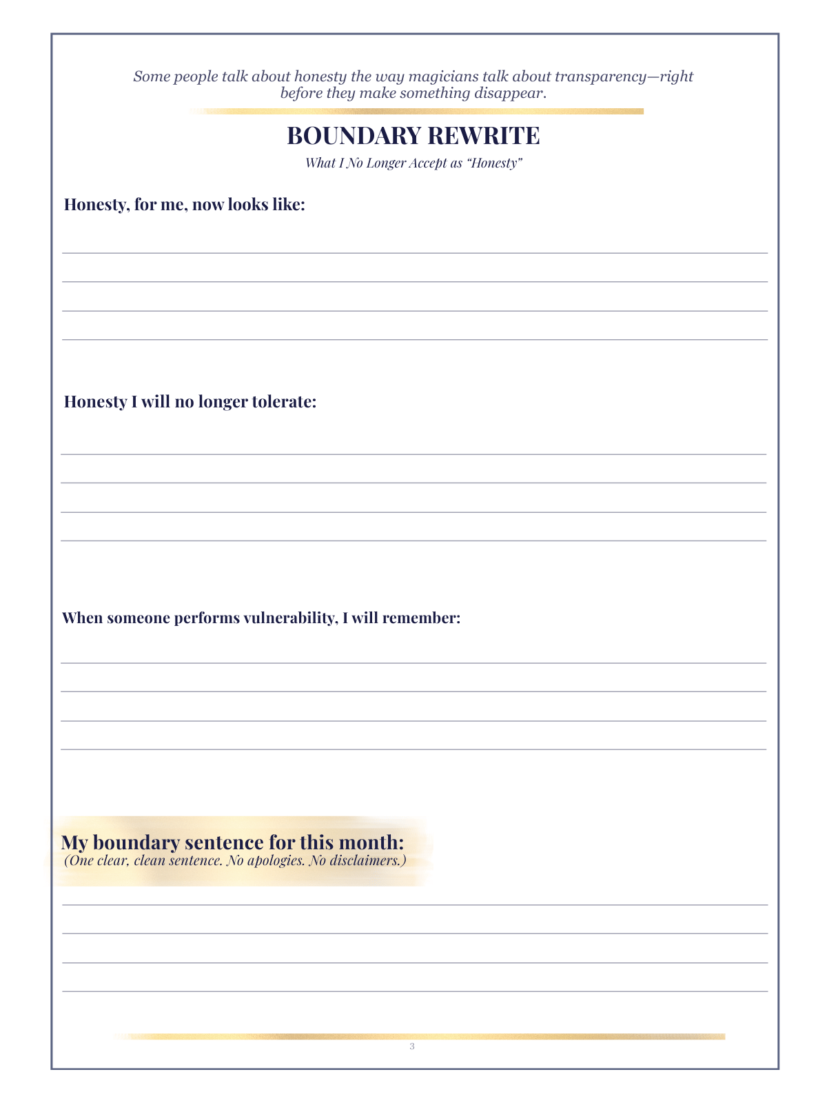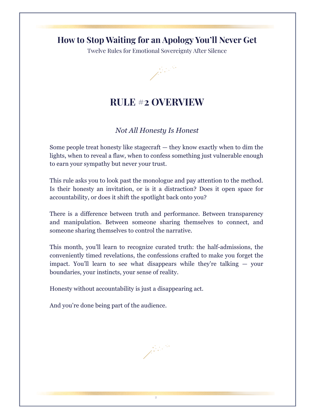 A 136-page printable journal, calendar, and emotional clarity workbook built around the Twelve Rules for Emotional Sovereignty After Silence. Designed as the deeper companion to How to Stop Waiting for an Apology You’ll Never Get, this workbook helps you break patterns, track your growth, and rebuild your emotional weather system one rule at a time.