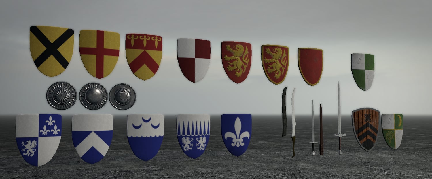 - 3 Swords, 2 Sheaths, 18 shields