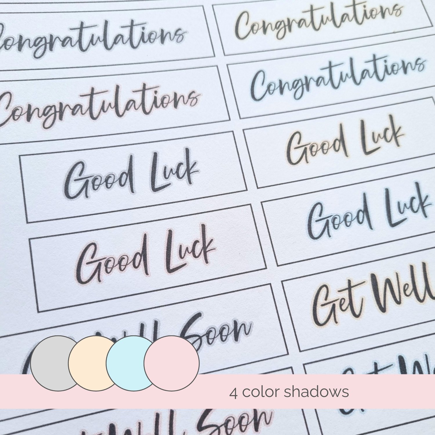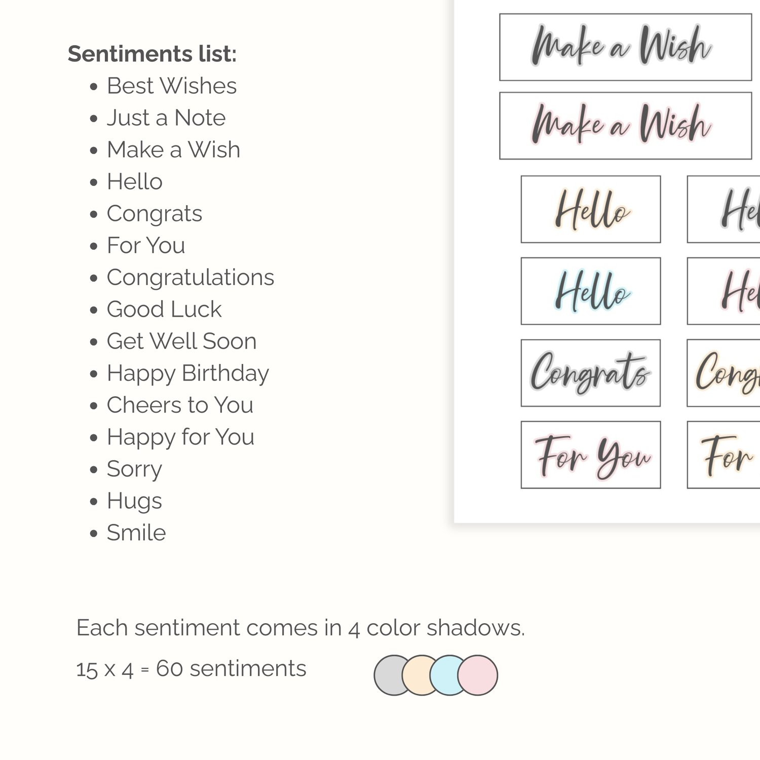 - Each of 15 sentiments (list on product photos) comes in 4 different color shadows (grey, light blue, light pink and light orange).