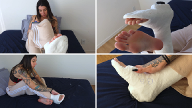 Rebeca enjoys her last moment in the cast. She studies it for a bit while showing off the cast, her foot, and the sole. Then, she interacts with the cast by running her hands over it and tapping it gently. She also draws three hearts on the cast with a pen. Finally, she records a video describing her experience with the cast.