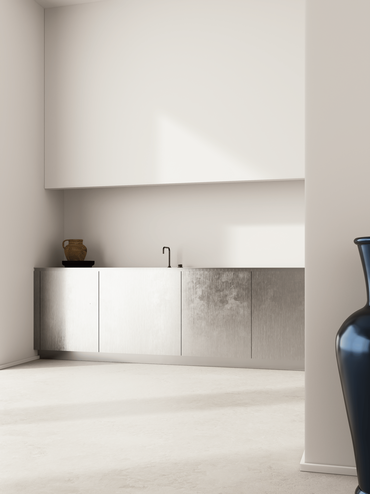 This interior scene was created entirely in D5 Render, with no AI used in the process. A study in light, reflection, and proportion — combining brushed metal finishes with soft neutral tones for a timeless minimalist aesthetic.