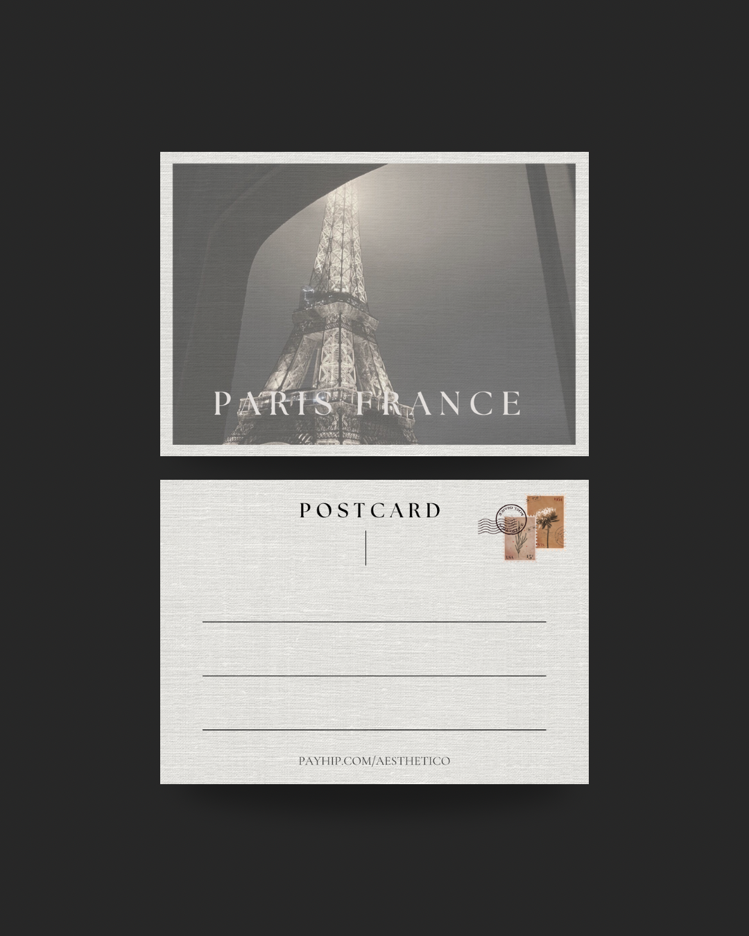 Experience the elegance of Paris with these ready-to-print postcard designs featuring the iconic Eiffel Tower. The designs have a sophisticated aesthetic and are available in dimensions of 1748x1240. Please note that colors may vary slightly depending on your screen. Some items shown in the images are for preview purposes only and are not included in the final file.