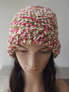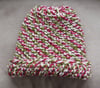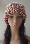 This super quick knit, striped, garter stitch beanie is worked diagonally. The chunky yarn is perfect for keeping out the cold winter chill.