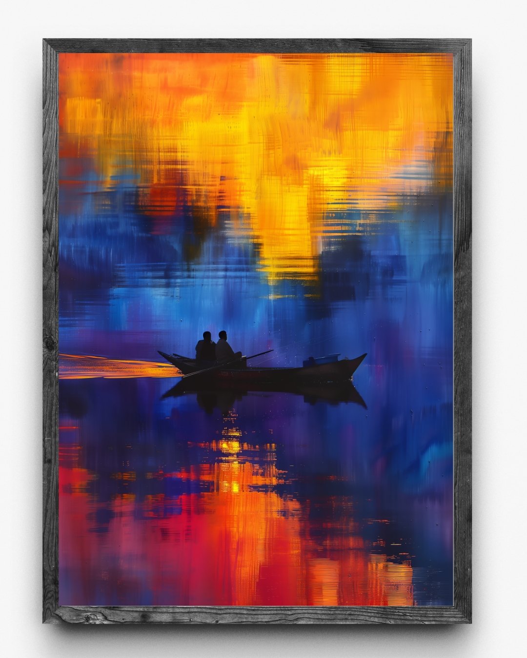Immerse yourself in the beauty of Twilight Serenity: Drifting into the Horizon, a mesmerizing digital painting capturing the tranquility of a boat ride at sunset. The blend of fiery golds and deep blues creates a dreamlike scene, where light dances on the water, evoking a sense of adventure and serenity. This striking wall art is perfect for modern interiors, adding a touch of color, mystery, and depth to your space.