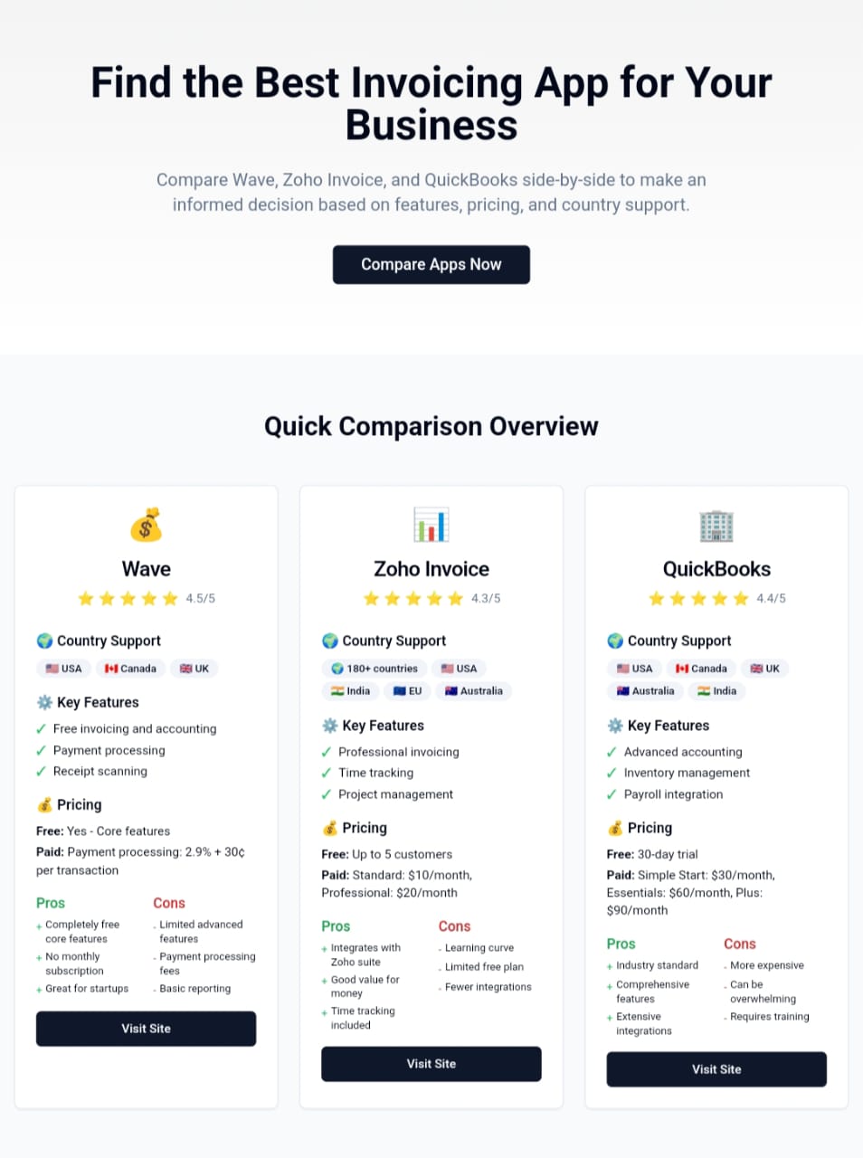 A sleek, responsive landing page template comparing top invoicing apps (Wave, Zoho Invoice, QuickBooks) by features, pricing, and country support. Perfect for SaaS reviews, affiliate marketers, or finance blogs.