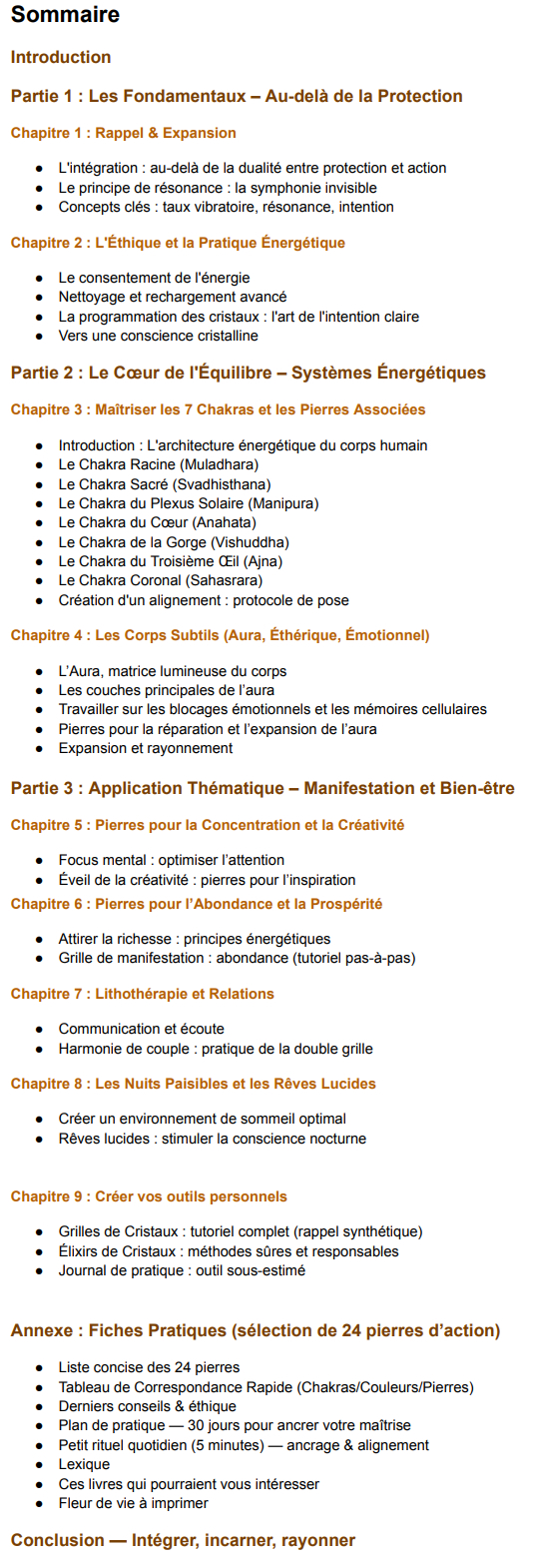 Vous maîtrisez les bases de la protection, mais ressentez le besoin d'aller plus loin ? L'Ebook "Les Cristaux d'Action" est votre passeport vers la lithothérapie avancée. Ce guide est conçu pour transformer votre pratique et faire de vous l'architecte conscient de votre énergie.