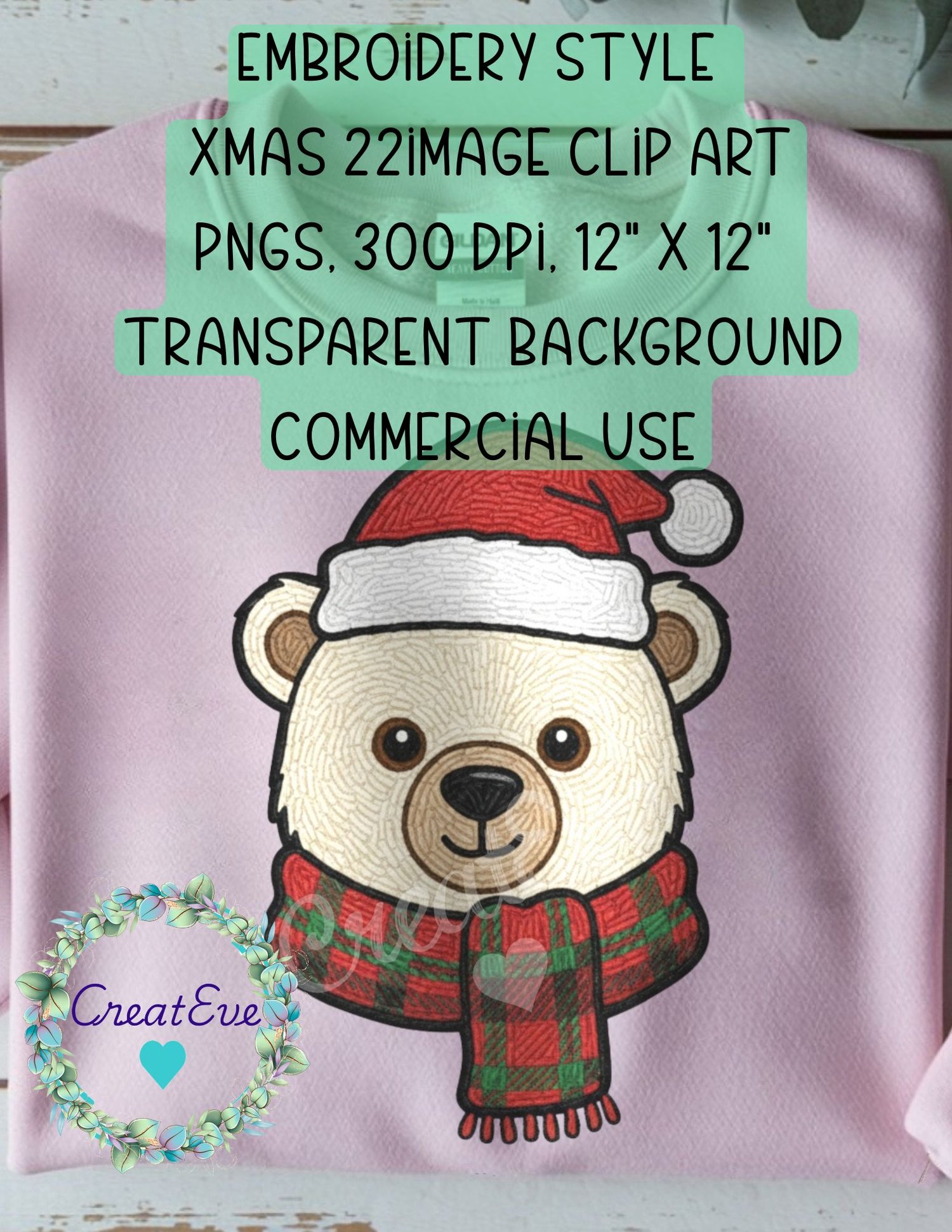 Embroidery Xmas Clip Art Pngs 22 Image Bundle, 300dpi, 12" x 12", Transparent Background, Commercial Use