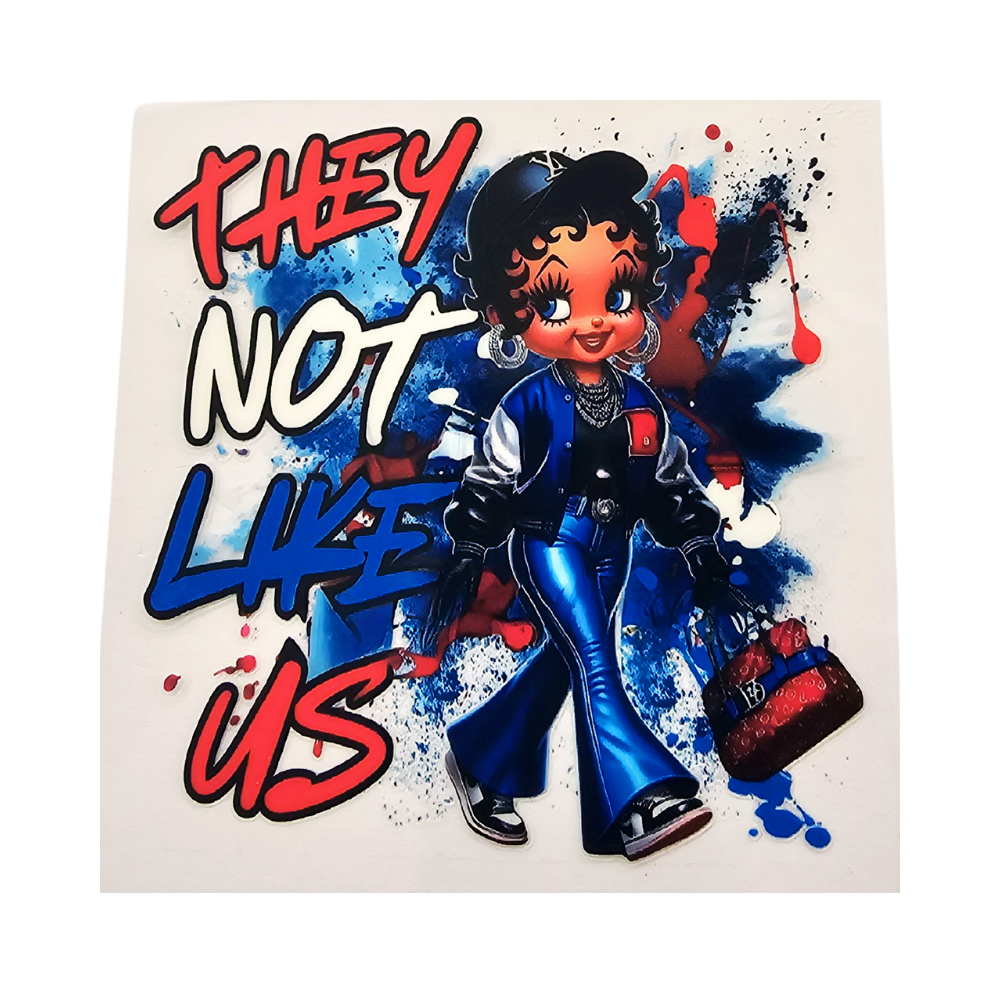 Let them stareβMiss B is making statements in bold blue with the confidence to match. The "They Not Like Us!" Decal is perfect for wrapping your favorite 16 oz Libbey glass, tumbler, or coffee mug, and just as flawless on journals, planners, or book covers. This UV DTF-ready transfer is made to stand out, just like her.