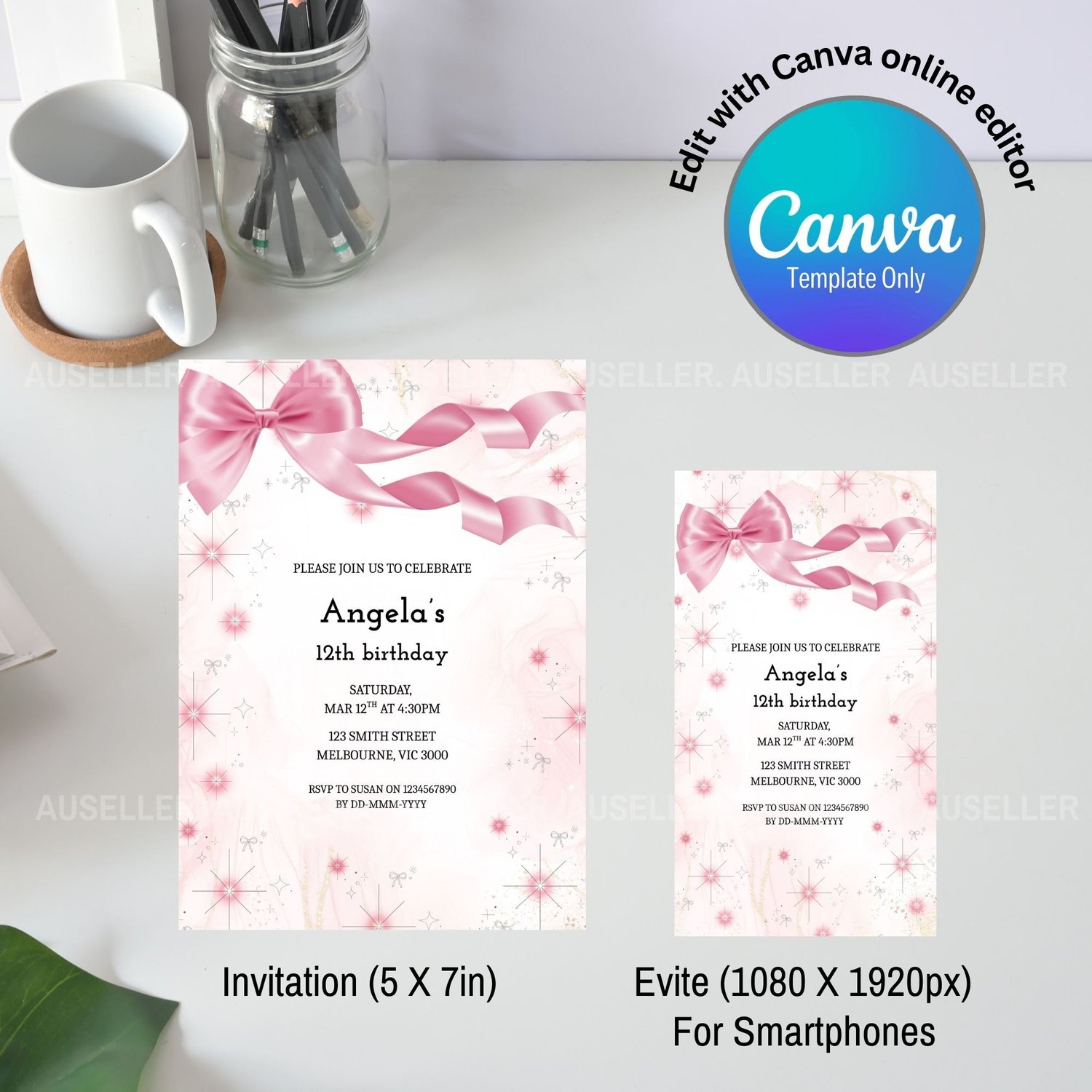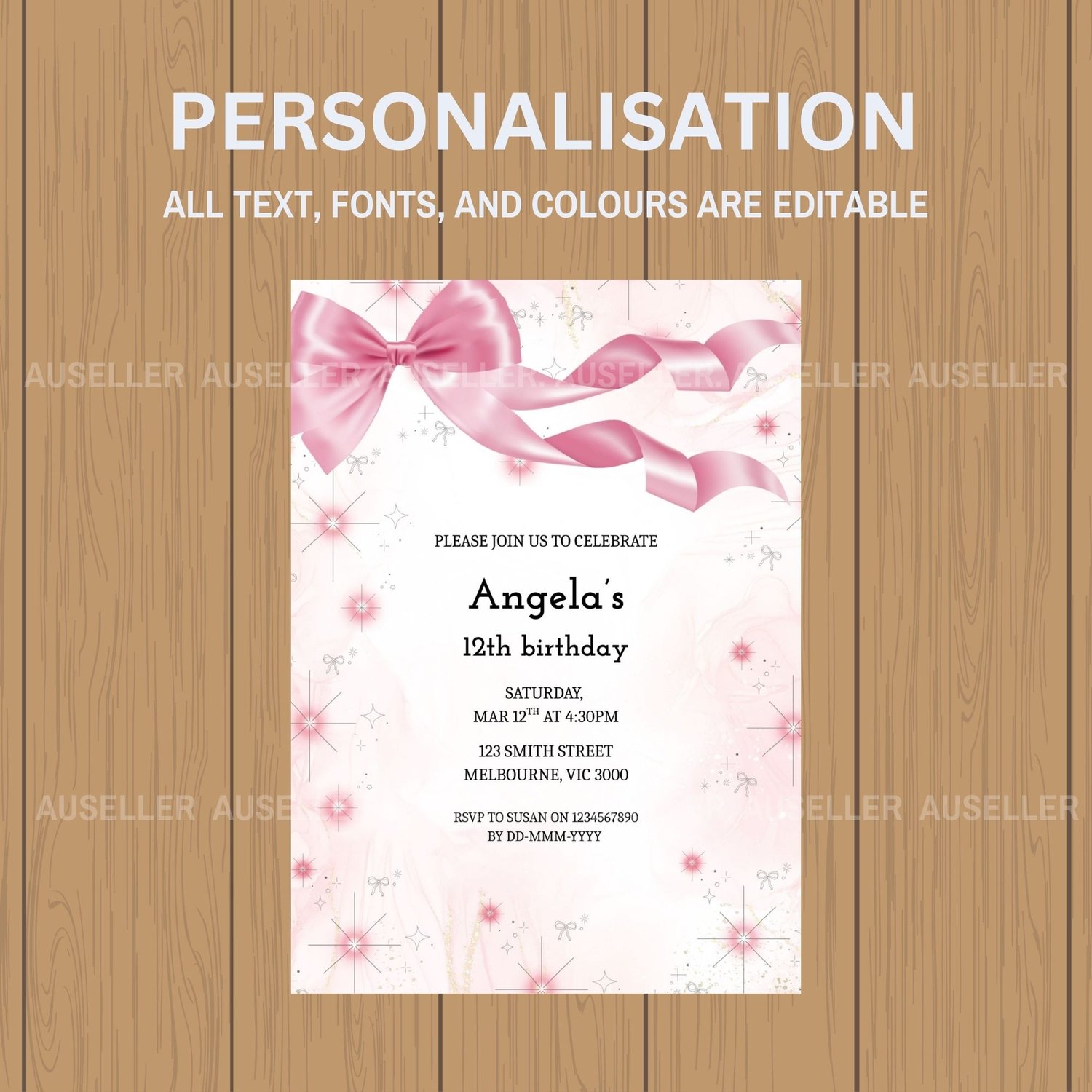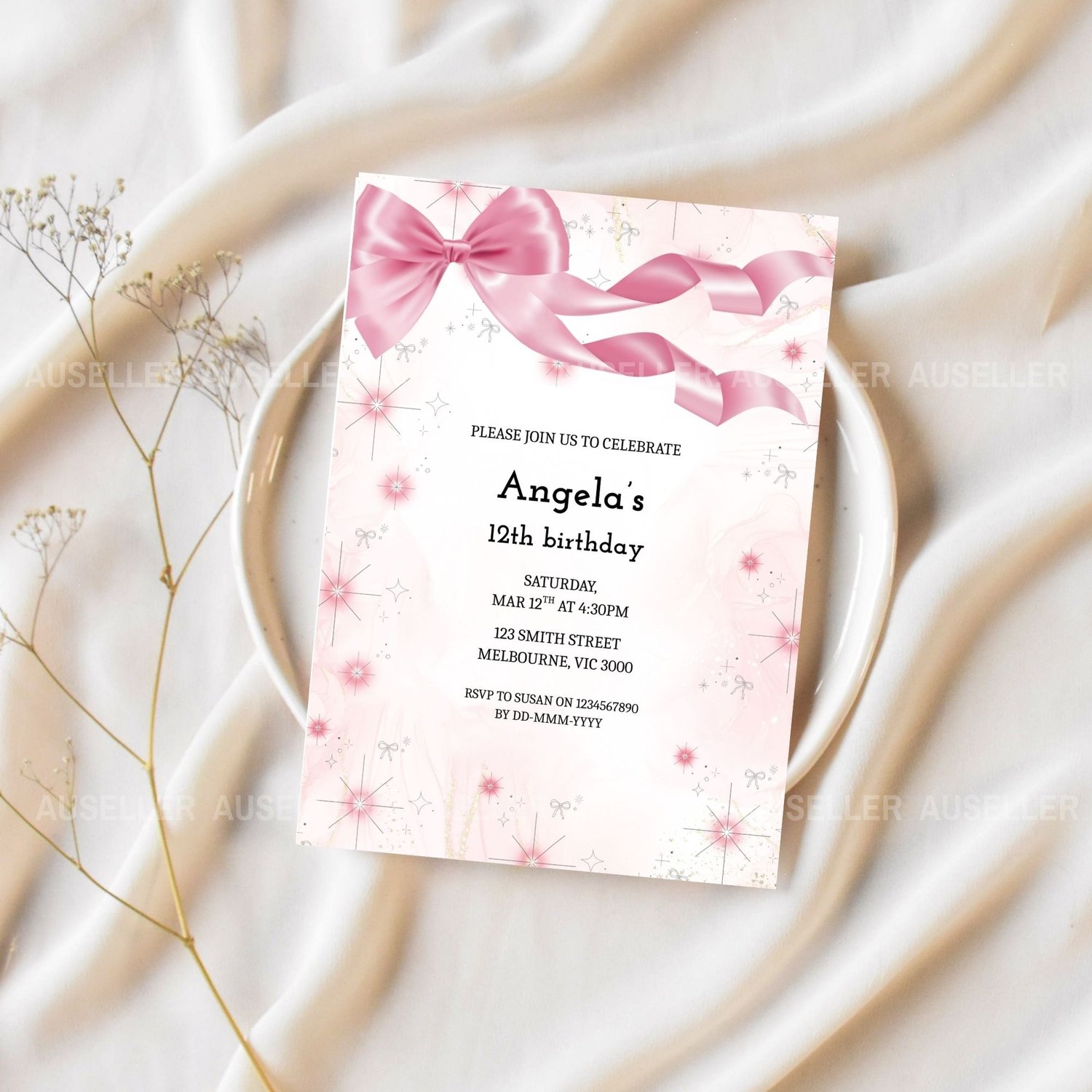 Celebrate your little girl's special day in style with our charming Pink Bow Birthday Invitation! This beautifully designed invitation features a soft pink background adorned with delicate sparkles, adding a touch of magic and whimsy. A pretty pink satin-style bow sits elegantly at the top, giving it a sweet and feminine finish. Perfect for princess-themed, fairy tale, or glamorous birthday parties, this invitation sets the tone for a fun and unforgettable celebration. Easily personalised with your event details, it's both adorable and elegant—just like your birthday girl!