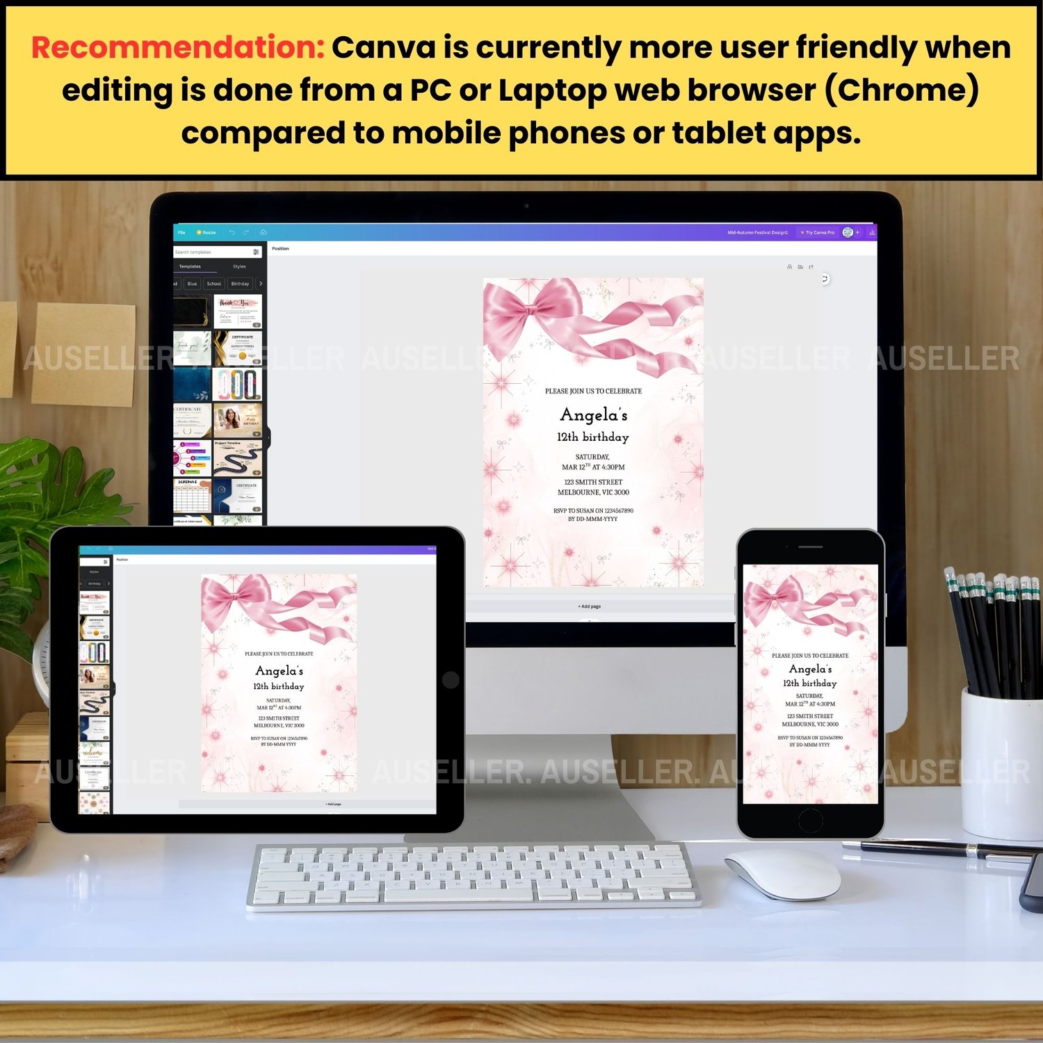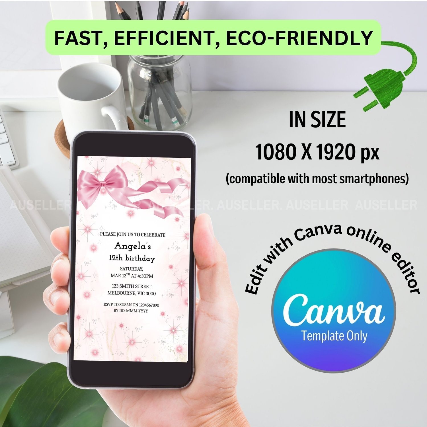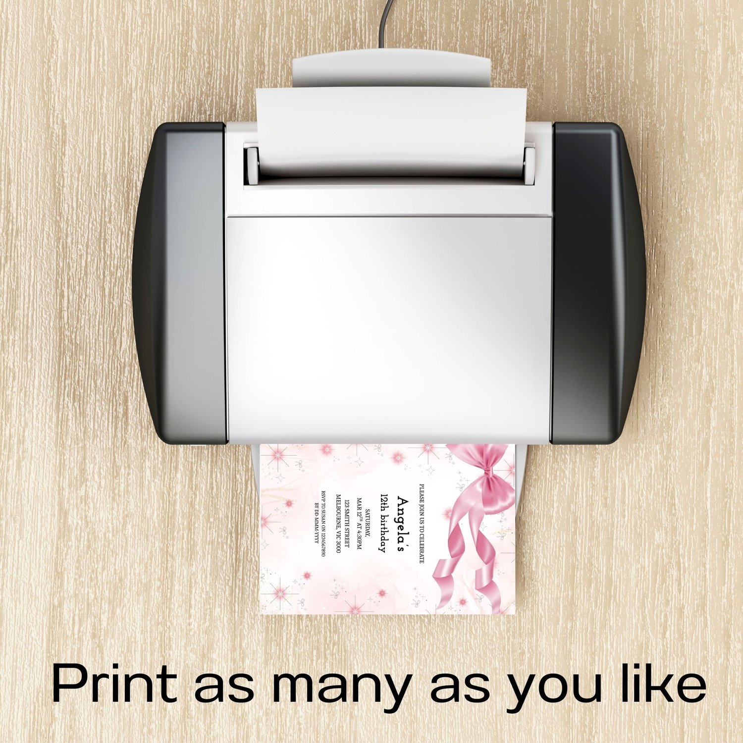 Celebrate your little girl's special day in style with our charming Pink Bow Birthday Invitation! This beautifully designed invitation features a soft pink background adorned with delicate sparkles, adding a touch of magic and whimsy. A pretty pink satin-style bow sits elegantly at the top, giving it a sweet and feminine finish. Perfect for princess-themed, fairy tale, or glamorous birthday parties, this invitation sets the tone for a fun and unforgettable celebration. Easily personalised with your event details, it's both adorable and elegant—just like your birthday girl!