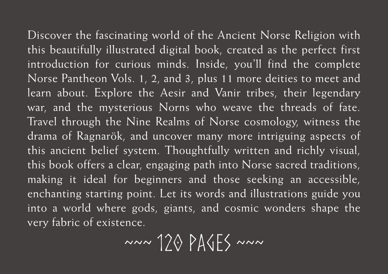 Discover the fascinating world of the Ancient Norse Religion with this beautifully illustrated digital book, created as the perfect first introduction for curious minds. Inside, you’ll find the complete Norse Pantheon Vols. 1, 2, and 3, plus 11 more deities to meet and learn about. Explore the Aesir and Vanir tribes, their legendary war, and the mysterious Norns who weave the threads of fate. Travel through the Nine Realms of Norse cosmology, witness the drama of Ragnarök, and uncover many more intriguing aspects of this ancient belief system. Thoughtfully written and richly visual, this book offers a clear, engaging path into Norse sacred traditions, making it ideal for beginners and those seeking an accessible, enchanting starting point. Let its words and illustrations guide you into a world where gods, giants, and cosmic wonders shape the very fabric of existence.
