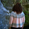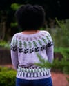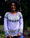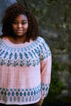 Herbaceous features sprigs of herbs fanned out around the yoke and arranged neatly around the lower body and sleeves. The body and upper sleeves incorporate staggered knot stitches to represent herbal buds and to add fun texture to the plain stockinette portions. The neckband, hem and cuffs are identical and use a stretchy faded rib. The design is worked top-down and in the round.