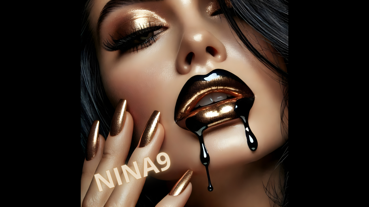 Portrait of a beautiful woman with long black hair,long golden nails and beautiful eyes. Golden black lipstick dripping from her lips.Ai generated image.HD resolution.Digital download.
