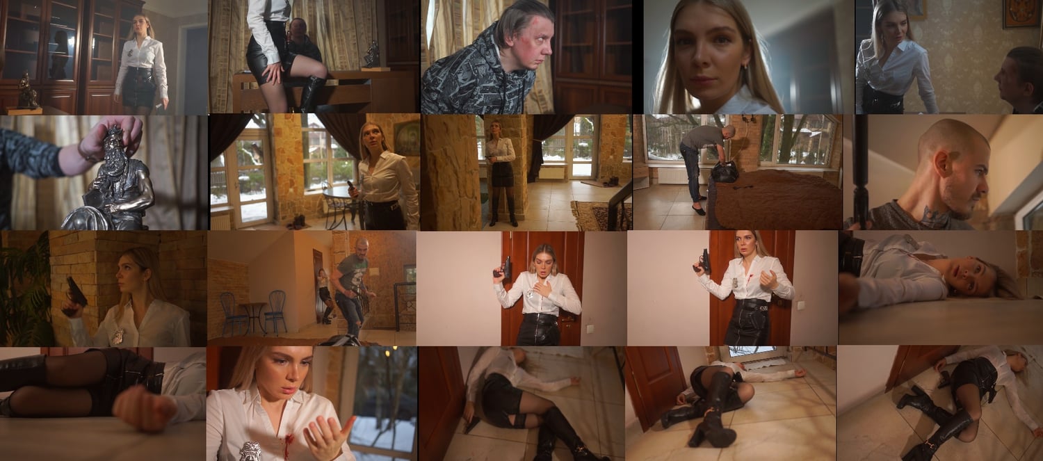 In the second act, at a dimly lit location, she draws her gun, searching cautiously with focused intensity. A brief shootout ensues; she hides and fires back. Suddenly struck in the chest, her face shifts to shock and fear. She cries out, falls on her back, and succumbs in agony. The film closes with poignant shots of her still form, marked by injury and torn clothing, subtitles enhancing the drama.