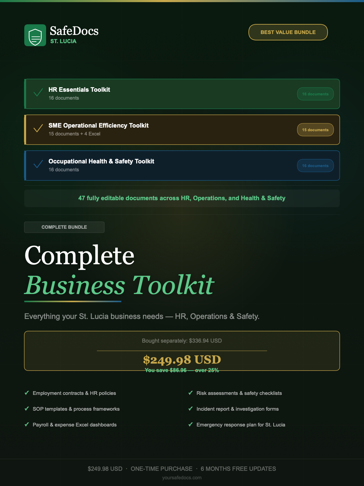 โ 47 fully editable documents โ Microsoft Word, Google Docs, and Excel โ Built for St. Lucia businesses โ Labour Code, NIC Act, and OHS Act compliant โ Emergency response plan includes verified St. Lucia contacts โ 911, Hospital, NEMO, LUCELEC, WASCO โ 6 months of free updates included for all three toolkits โ Email support:ย businessautopilot@yoursafedocs.comย โ Licensed to one business โ not for redistribution