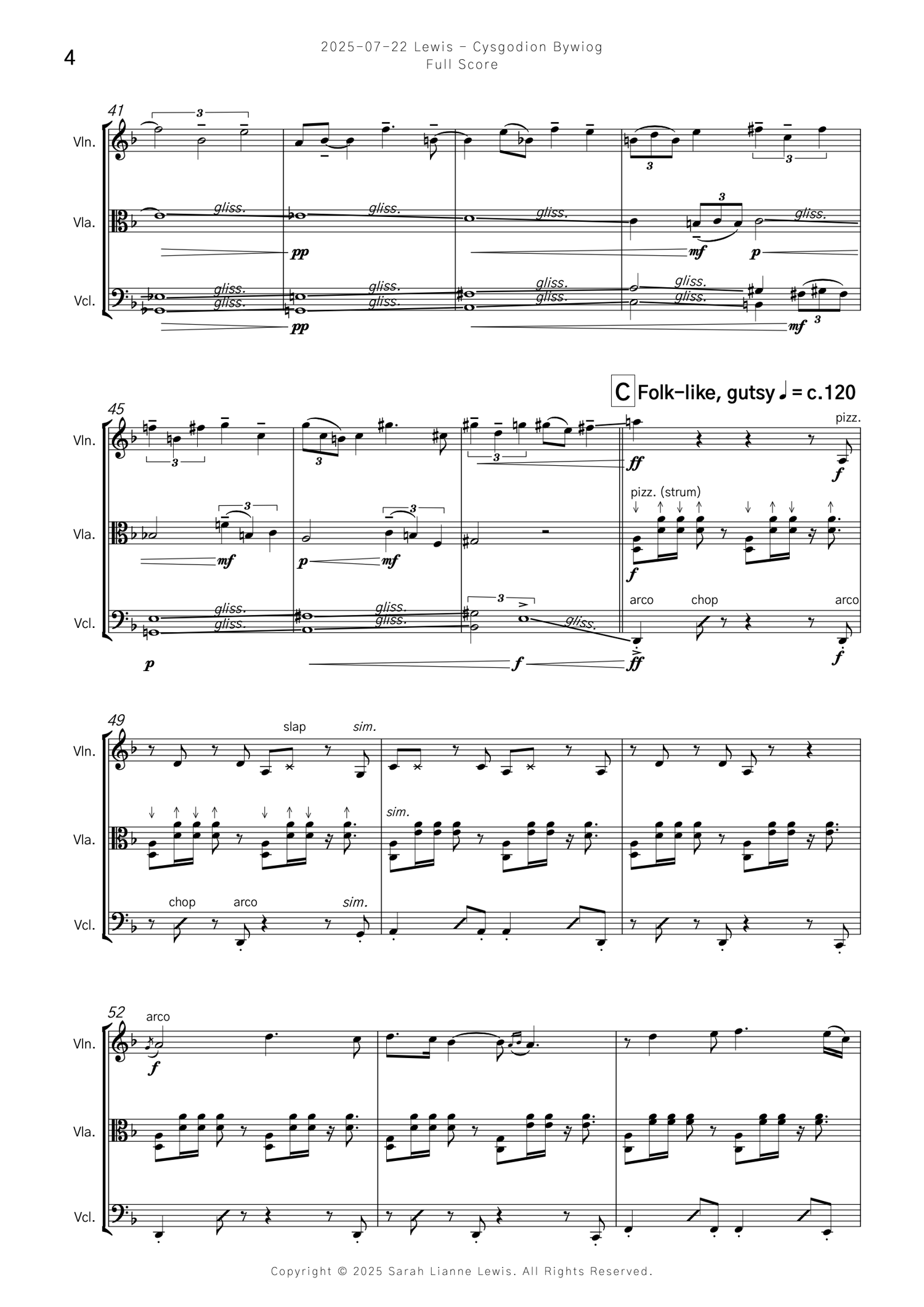 In ‘Cysgodion Bywiog’ melodic fragments appear throughout the piece that are derived from the traditional Welsh folksongs ‘Min y Môr’ and ‘Llanover Reel’ – both referenced in the novel – in descriptions of the rich cultural life in a utopian version of Future Wales. They appear half-formed and distorted, disappearing as quickly as they appear, remembered and reimagined. The texture moves between quiet, simple lines – reflective of the isolated nature of the elderly woman – and moments of warm, energetic joyful folk rhythms, indicative of the power of memory and music, and the importance of folk traditions to Welsh cultural identity.