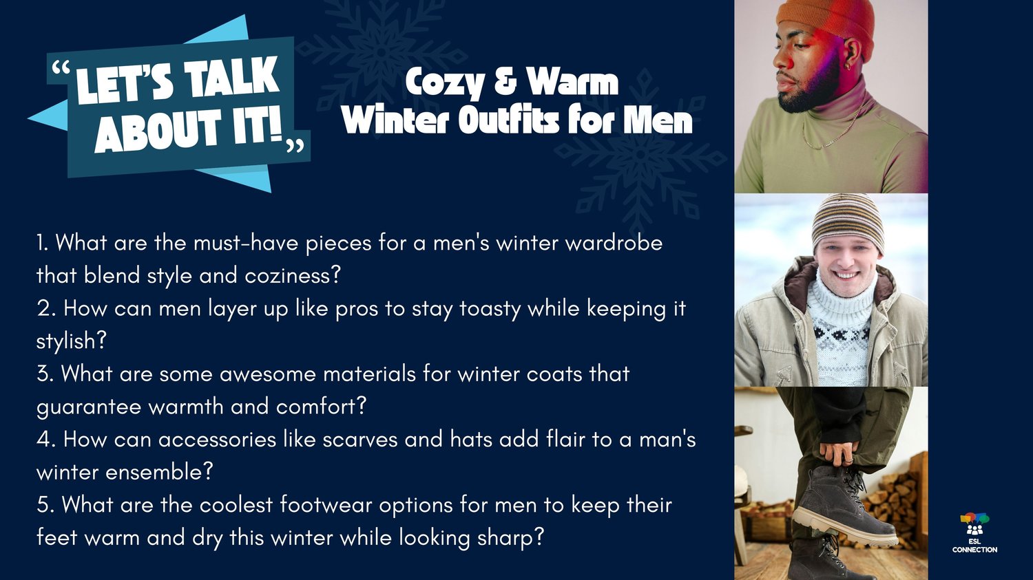 Conversation starters about men's winter outfits are fantastic topics because they blend practical fashion tips with social fun. Men are always on the lookout for ways to express their unique style while staying cozy in the chilly months, so winter fashion is both relevant and exciting. Chatting about this can spark new ideas on creative layering, the coolest trends in outerwear, and picking the perfect accessories.