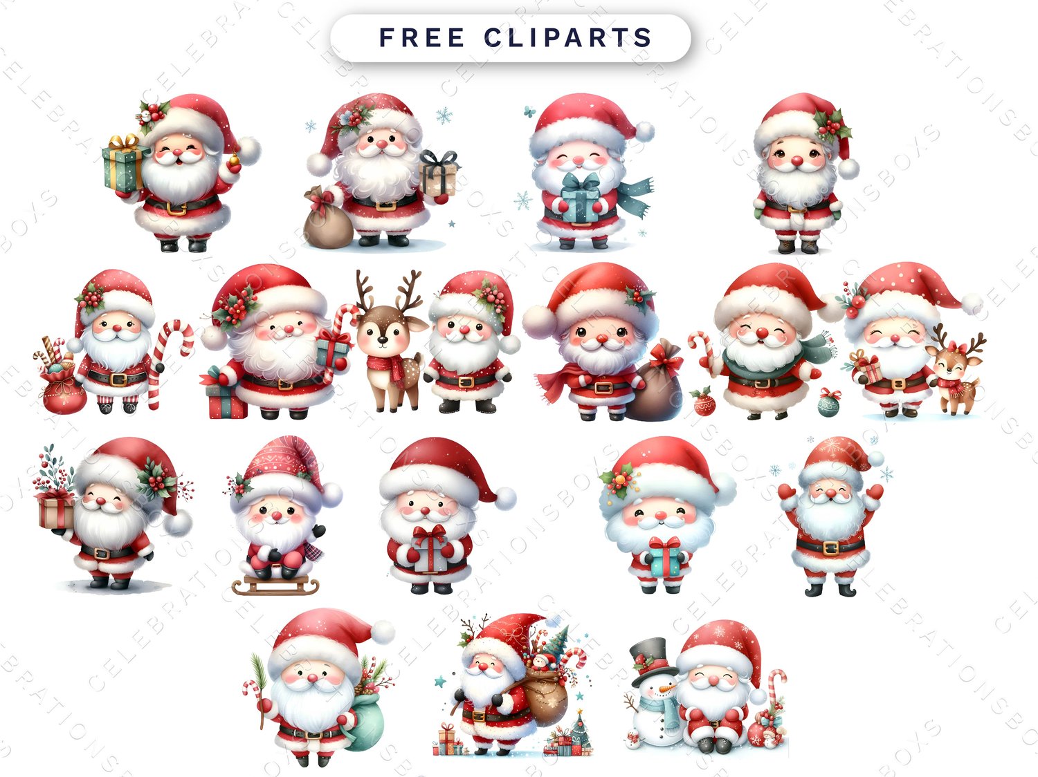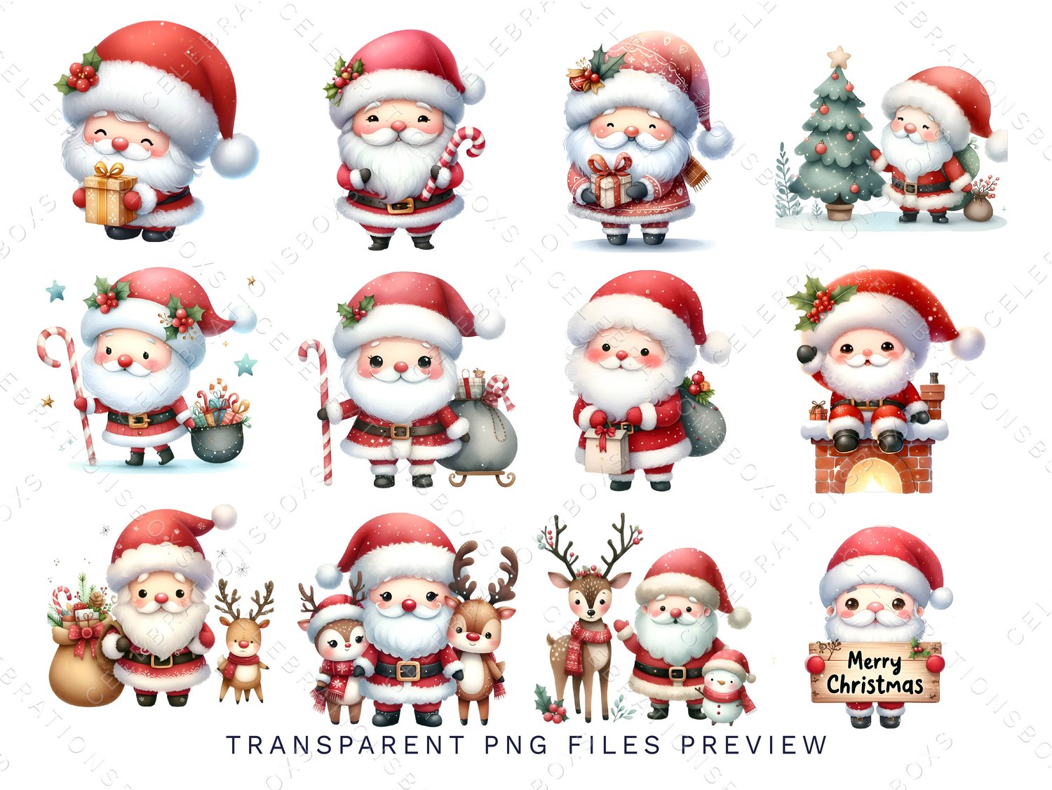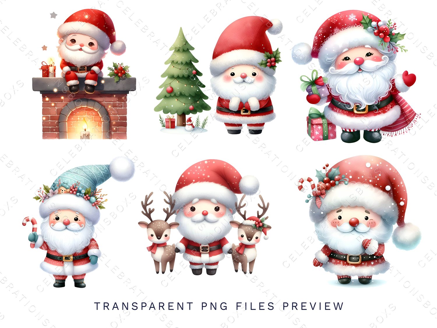 Get ready to add a touch of adorable holiday cheer to your Christmas projects with our delightful Christmas Santa Claus Bundle. This charming collection includes watercolor Santa clipart images that are perfect for all your creative endeavors.