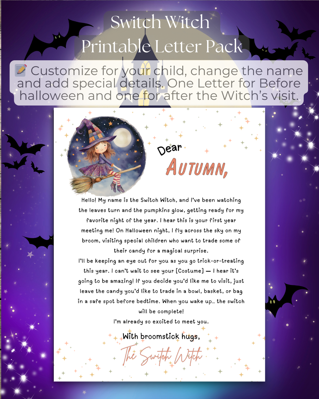 Create a magical Halloween tradition that helps kids cut back on candy while keeping the fun alive! This beautifully designed printable set gives you everything you need to invite the Switch Witch into your home year after year.