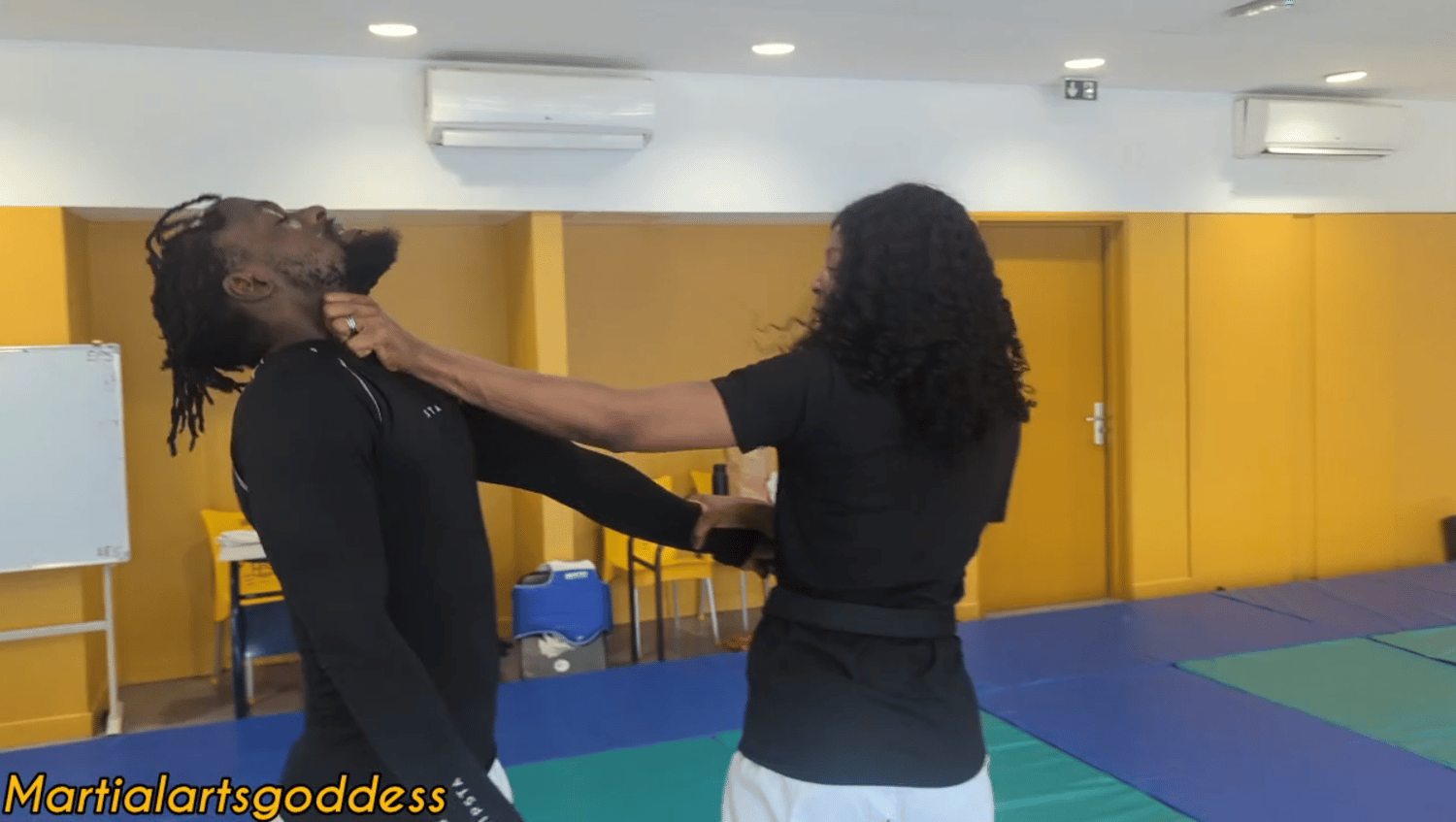 kicks, punches, locks, pinned on wall, throws