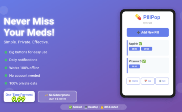 PillPop is a beautifully simple pill reminder app that works right in your browser - no installation, no accounts, no subscriptions. Just download, open, and start tracking your medications today.