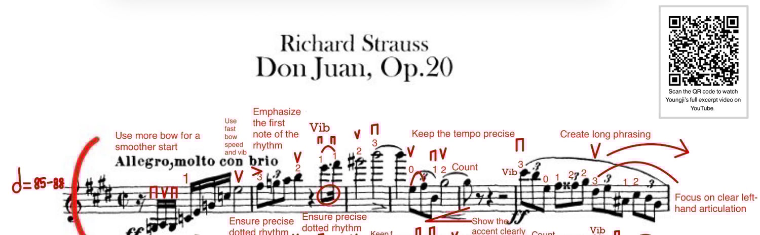 Each excerpt includes my personal bowings, fingerings, phrasing, musical ideas, audition tips, and practice strategies — refined through years of performing and auditioning with top orchestras.