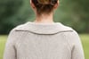 The collar begins with a narrow band of ribbing on either front, which widens every few rows until all of the front stitches are worked in ribbing. To finish off the collar, stitches are worked in ribbing for a few inches across the top of the fronts, sleeves, and back, and the collar is shaped at the top edge using short rows, then bound off.