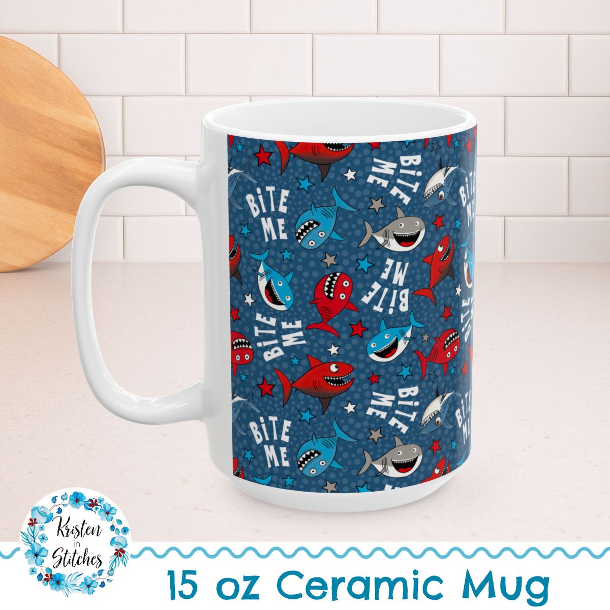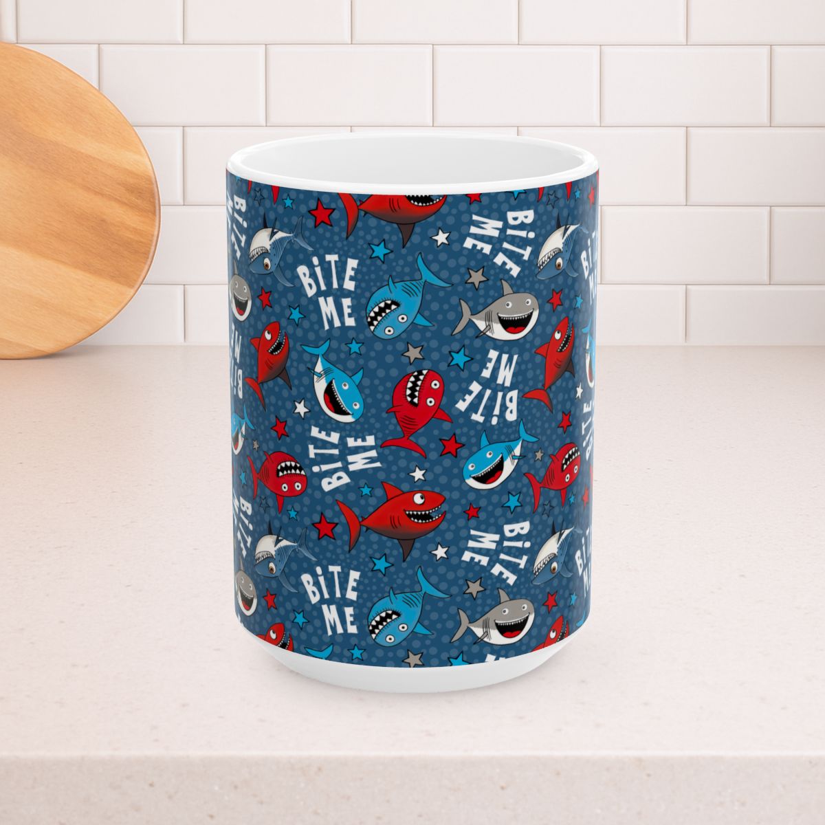 Bite Me Sarcastic Sharks 15oz Ceramic Mug, Large Coffee Cup