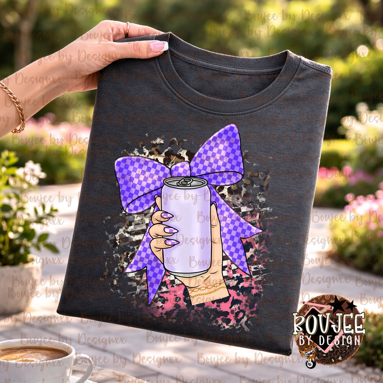 Trendy girly graphic PNG featuring a bold purple checkered bow with hand holding a can — perfect for boutique apparel and statement tees.