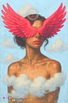 AI-generated artwork, featuring a woman with bold pink wings gracefully covering her eyes, set against a soft, cloud-filled sky. Her natural tones and delicate features contrast beautifully with the vibrant wings, while painterly textures create a dreamy, ethereal mood that feels both surreal and serene.