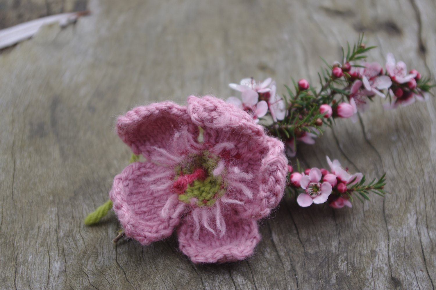 This wee tea tree is knit using double pointed needles. It begins with the receptacle and works outwards to complete each of the petals individually and seamlessly The stem is created using i-cord which can be thread onto wire to provide greater structure.