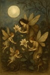 Bathed in the soft glow of the full moon, four luminous fairies awaken sleeping flowers in a secret twilight garden — a scene filled with calm, mystery, and wonder.