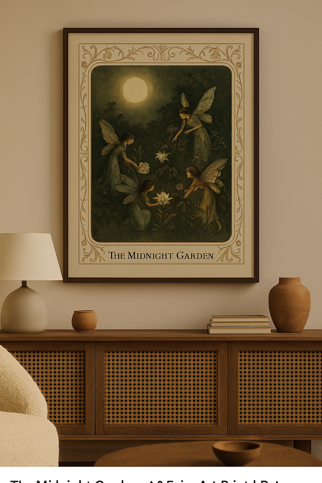 Step into the moonlit magic of The Midnight Garden, a high-resolution fairy art print inspired by the enchanting world of Peter Pan.