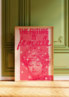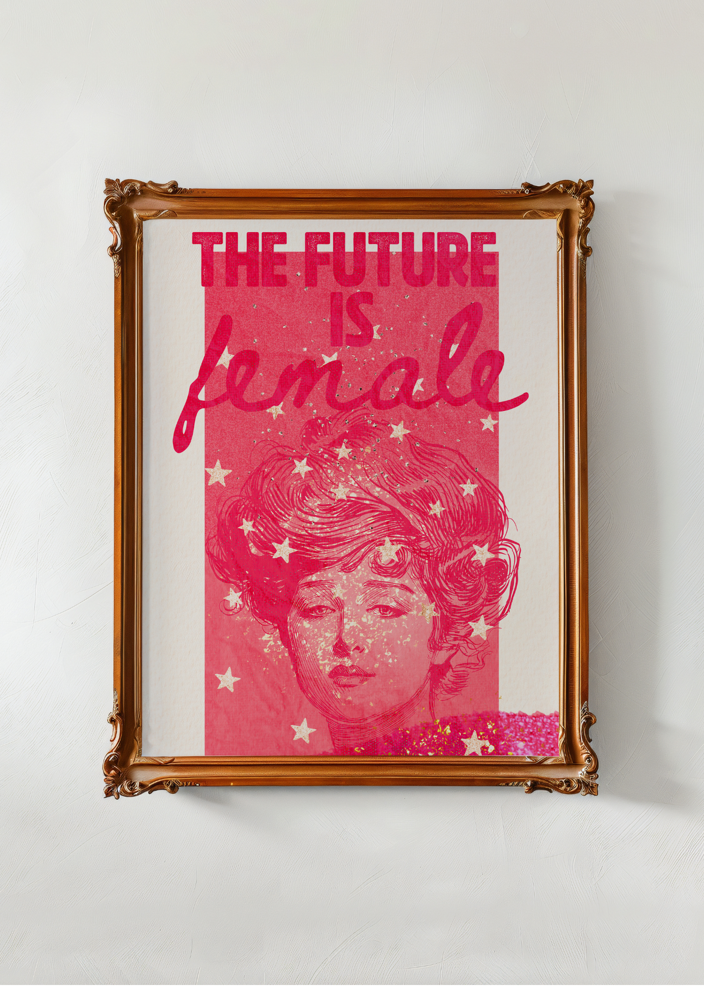 The Future is Female— A bold pink textured background anchors this powerful print. A soft pink, line-drawn woman rests beneath a scattering of white stars, crowned by the phrase "The future is female" in fun, fearless font. It’s a tribute to womanhood, strength, and the power of rising together.