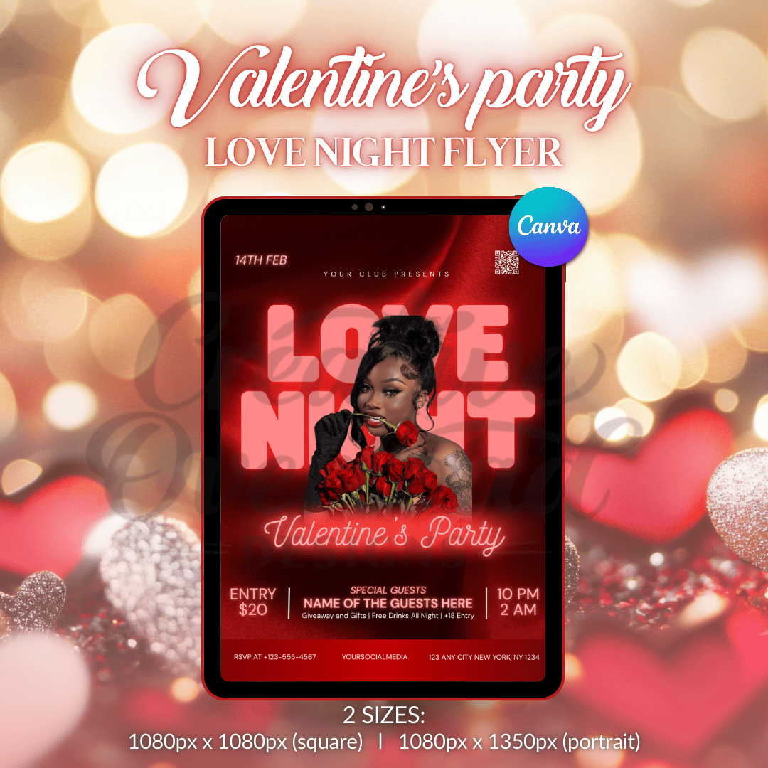 Your Valentine promos deserve a flyer that looks like it came from an actual event designer. This editable Valentine's Party Love Night flyer template is built for nightlife flyers, club events, DJ sets, themed parties, live shows, lounges, and special Valentine experiences. Clean typography, bold color, and space for your feature model make it easy to promote an event that actually sells out.