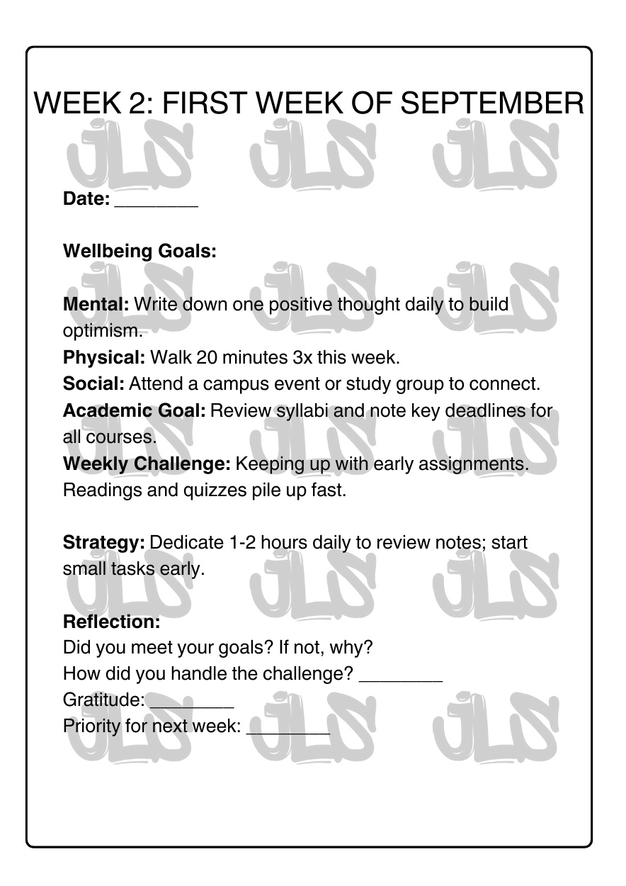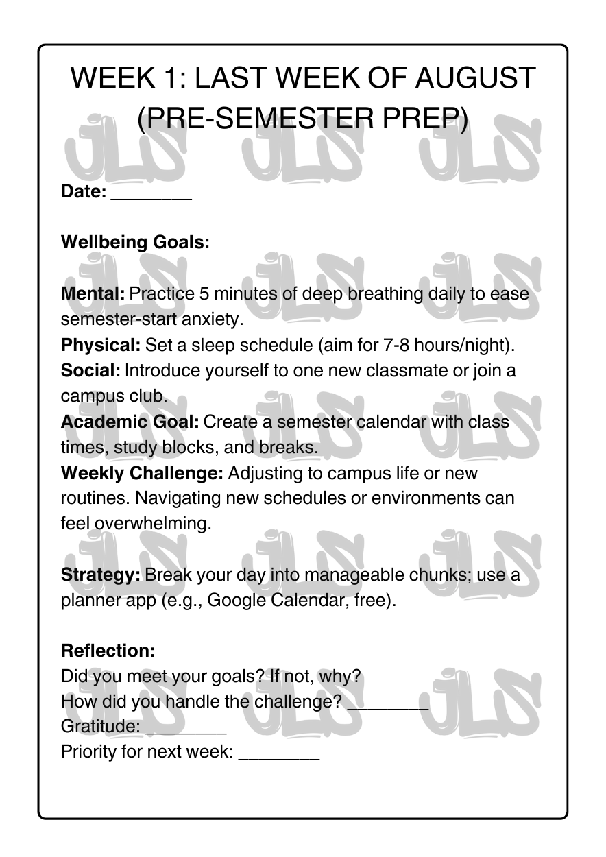 This planner is a comprehensive tool designed to help students balance their academic and personal lives throughout the school year. It provides a structured framework for setting weekly goals, tracking progress, and anticipating challenges for both the Fall (August to mid-December) and Spring (mid-January to April) semesters. The journal spans 70 pages and includes dedicated space for reflection, allowing students to review their weekly performance and make necessary adjustments.