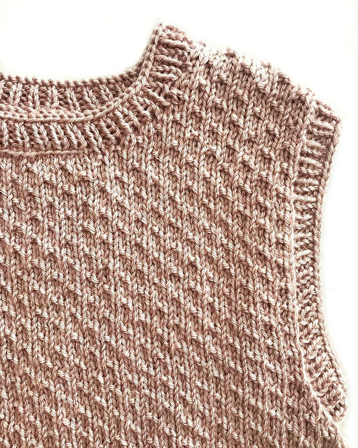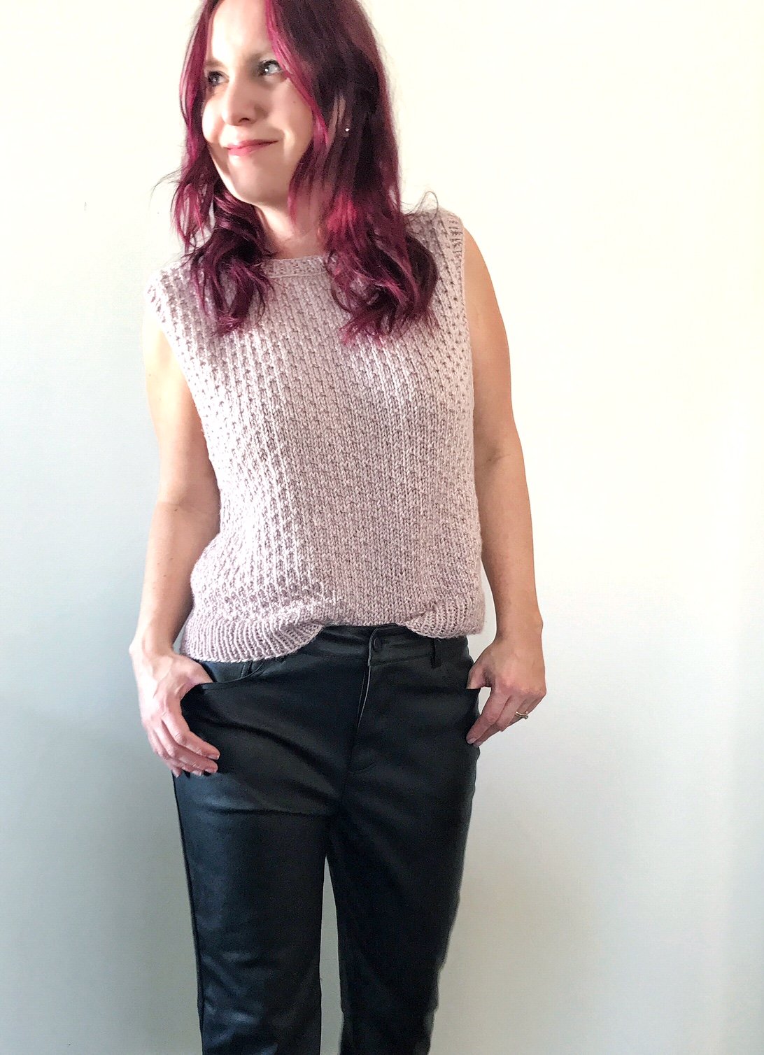 This easy to knit top can be worn alone, over a shirt, or under a blazer for versatile looks. The vest is knit in the round and only seamed at the shoulders. Suitable for a beginner knitter comfortable working in the round.