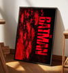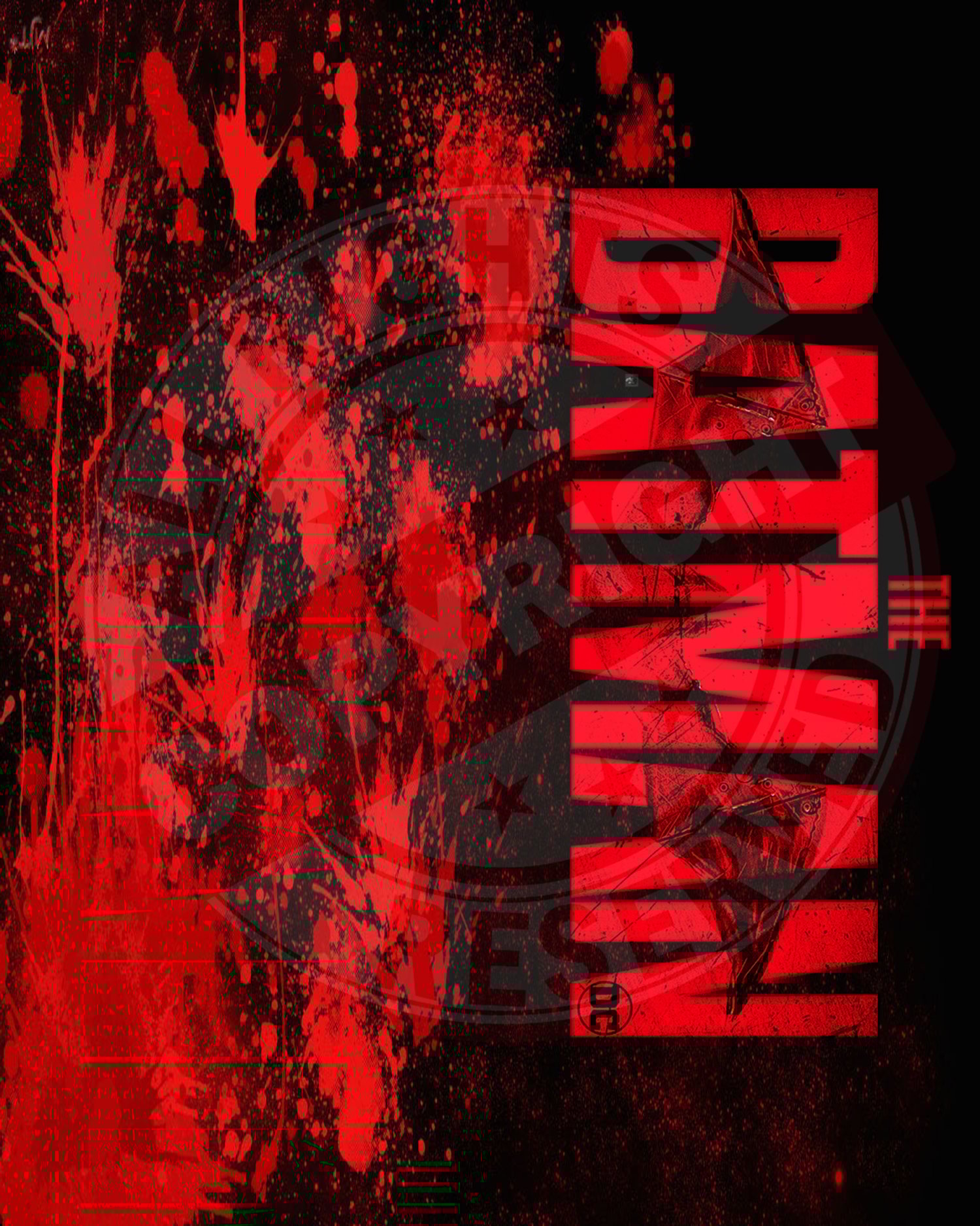 - Red Batman logo, Dark Knight version, placed vertically on the right side.