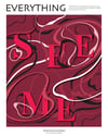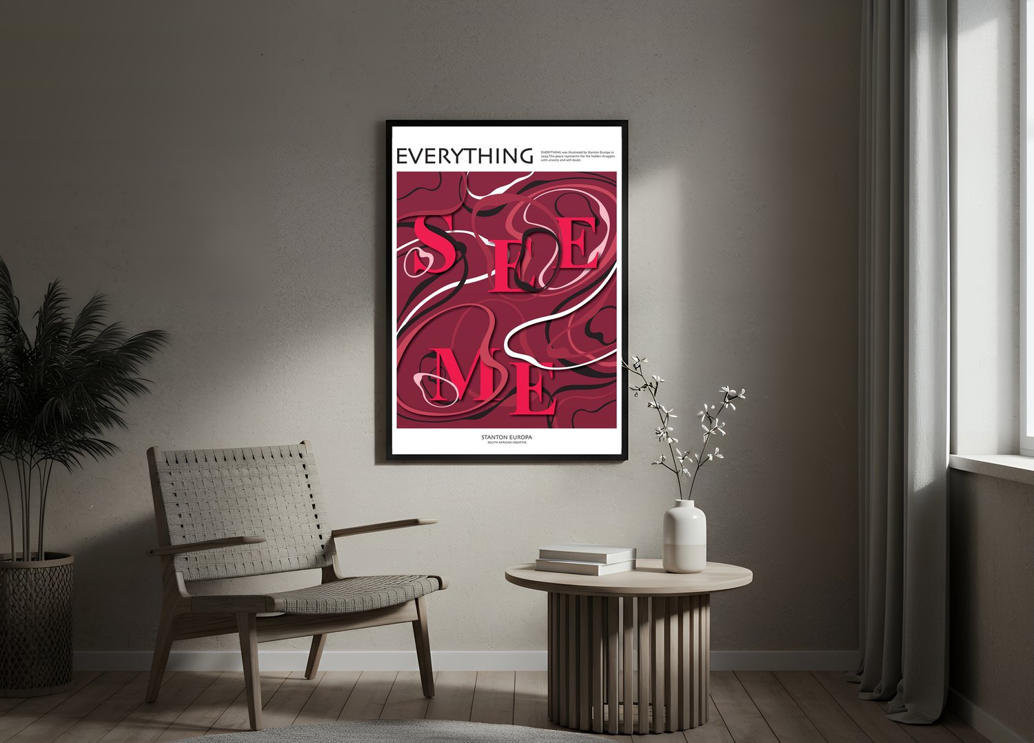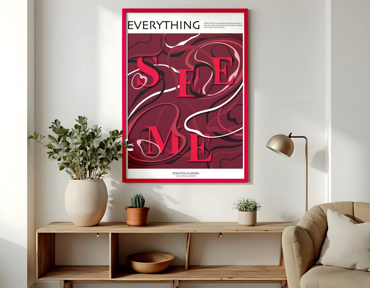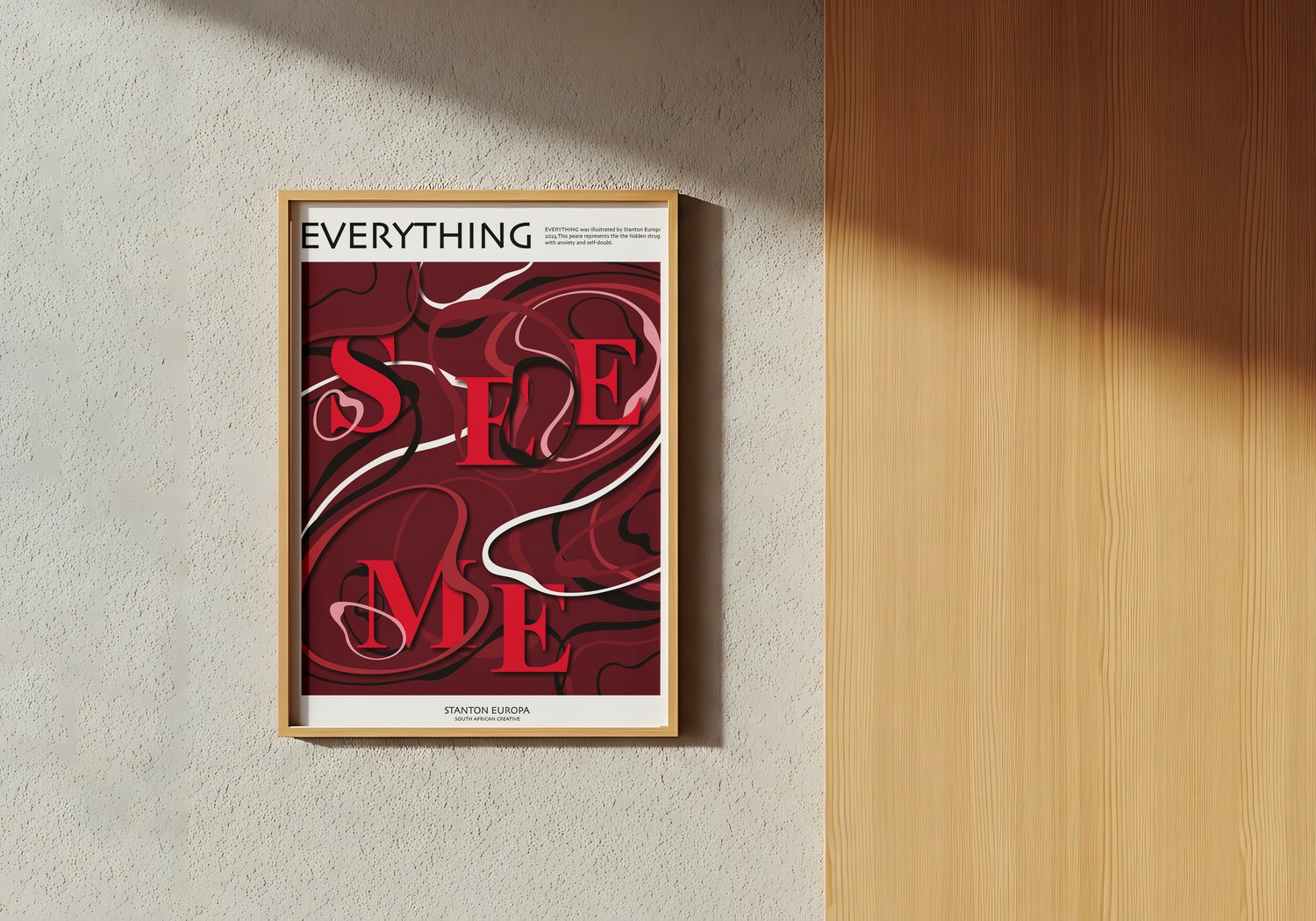 Everything is a powerful modern art print illustrated by Stanton Europa in 2023. The artwork blends expressive red tones, flowing abstract shapes, and bold typography to create a visual representation of hidden emotion.