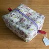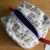 There are two fabric options at present: cream with leaves and berries print and purple zip or William Morris blue flower print with pink zip.