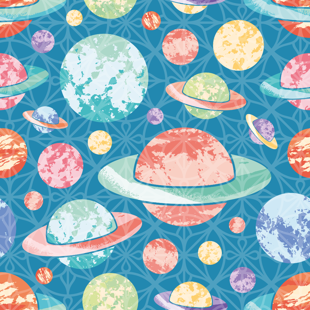 Textured planets seamless pattern background. Cartoon cosmos vector illustration.